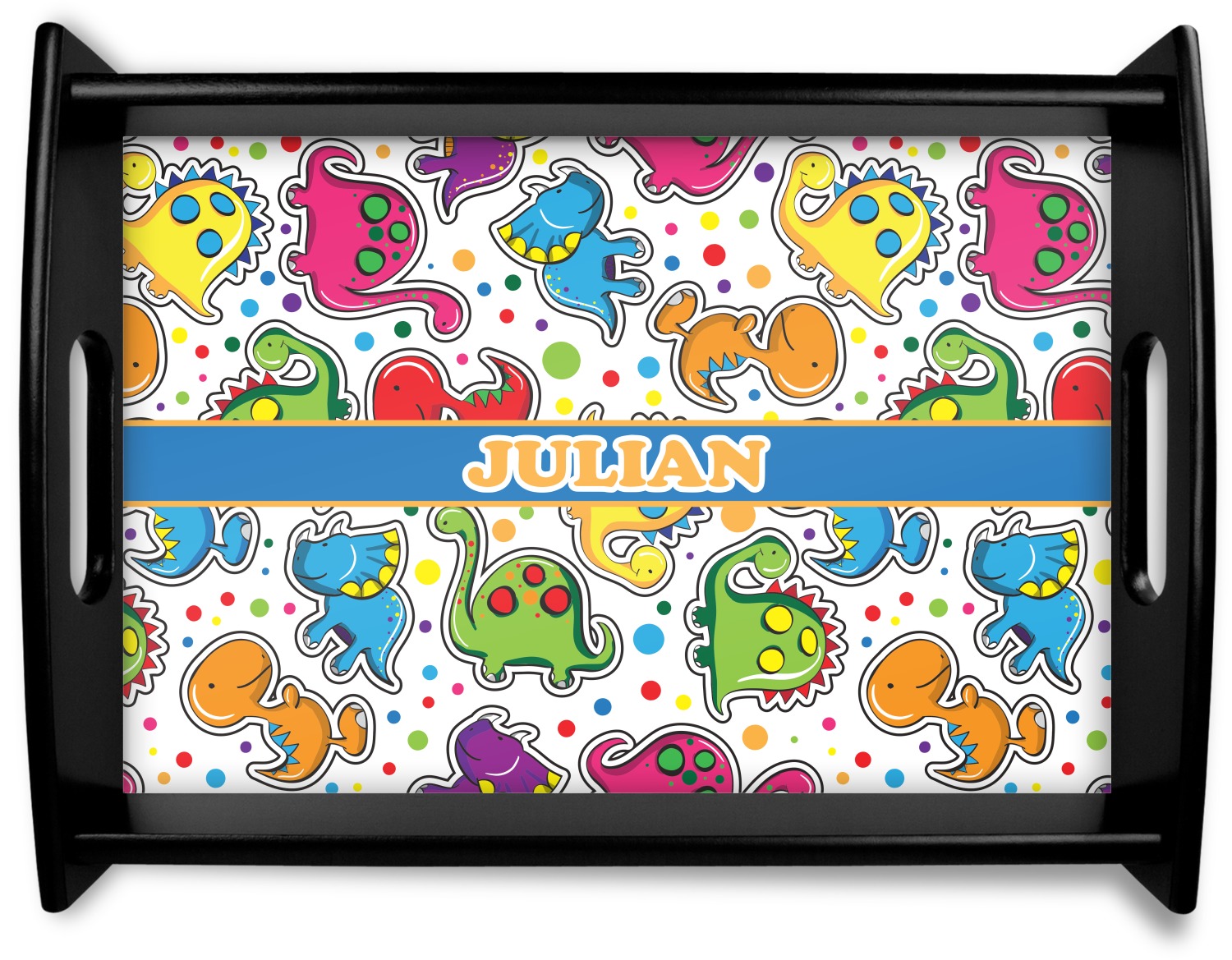 This serving tray with handles features square edges and two rounded sides, creating a very modern look. Each side is fabricated from a beautifully cut, natural wood. The bottom of the interior of the tray displays your customized design in bright, vibrant color. The tray is sold in both a black color and a natural wood look. Each variation of the wood serving tray has two sizes: Small, which is 14" x 10" x 2.25", and Large, which is 19.5" x 13.5" x 2.75".