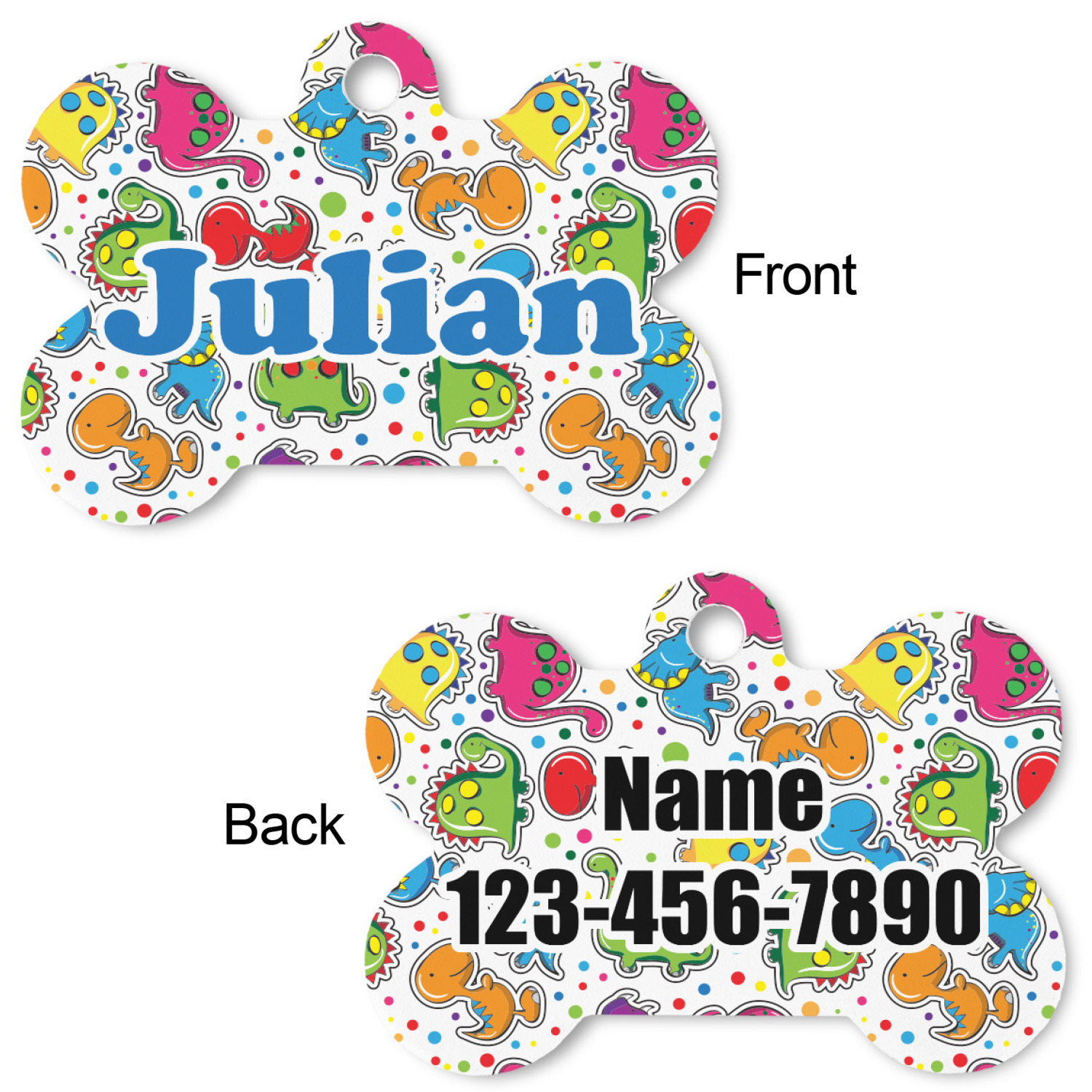 Our default design templates print your dog's personalization on the front and your contact information on the back; however everything is customizable, so you customize the patterns, the colors, the personalization, the contact information etc.