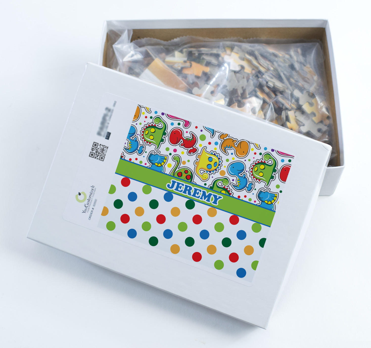 You can also upload your logo or art that you or your kids drew. To create more challenging jigsaw puzzles, you can create a pattern from with your logo or artwork. You can also add other elements such as text or personalization.