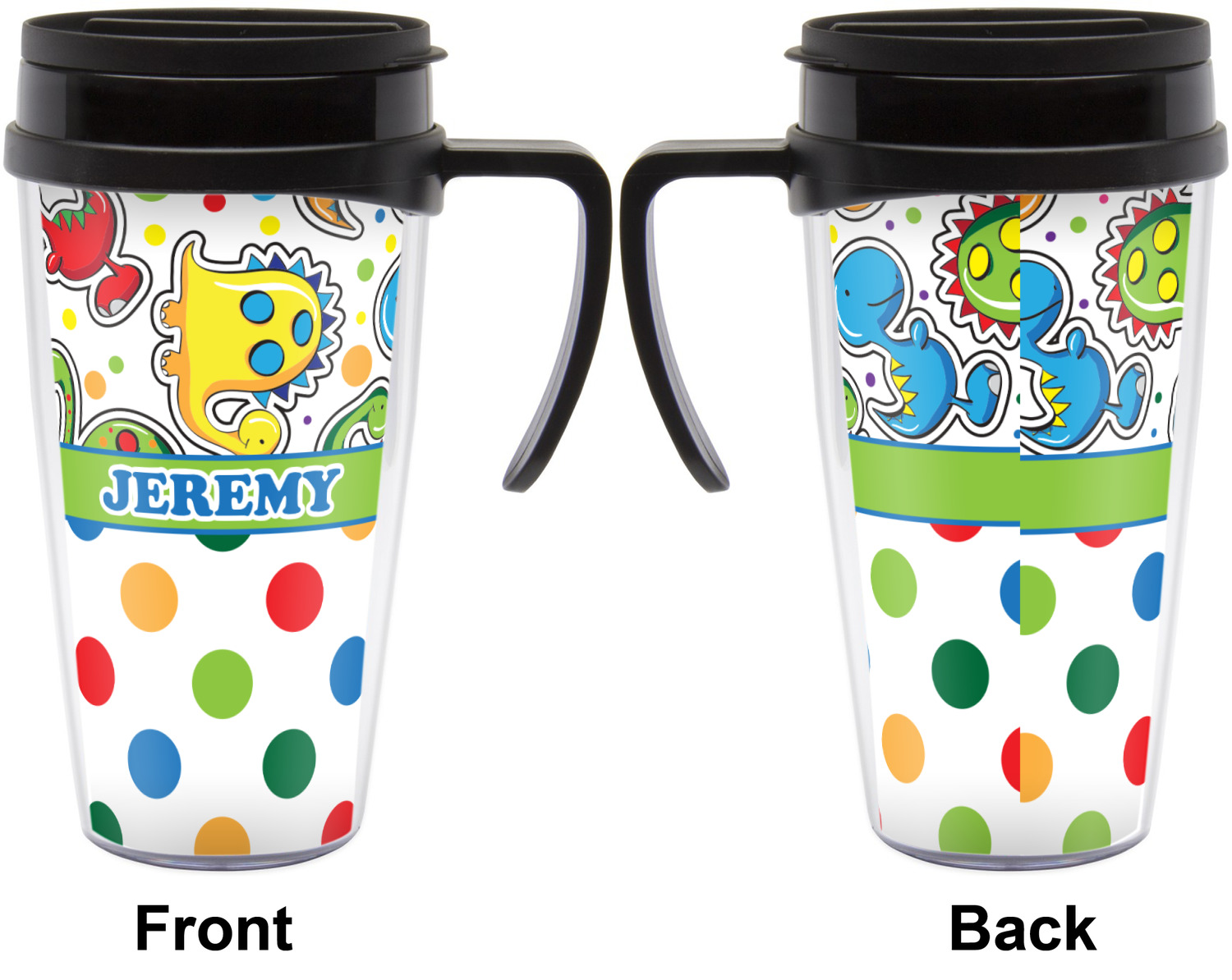These thermal mugs are free of BPA, and insulated, to keep your drinks hot or cold. The black, snap on lid and the slider for sipping allows you to conveniently sip your drink without constantly worrying about a disastrous spill. We offer this mug with and without a handle, to better suit your needs. Each custom thermal mug holds up to 16 ounces of liquid and displays your customization on all sides on premium gloss media inserts.