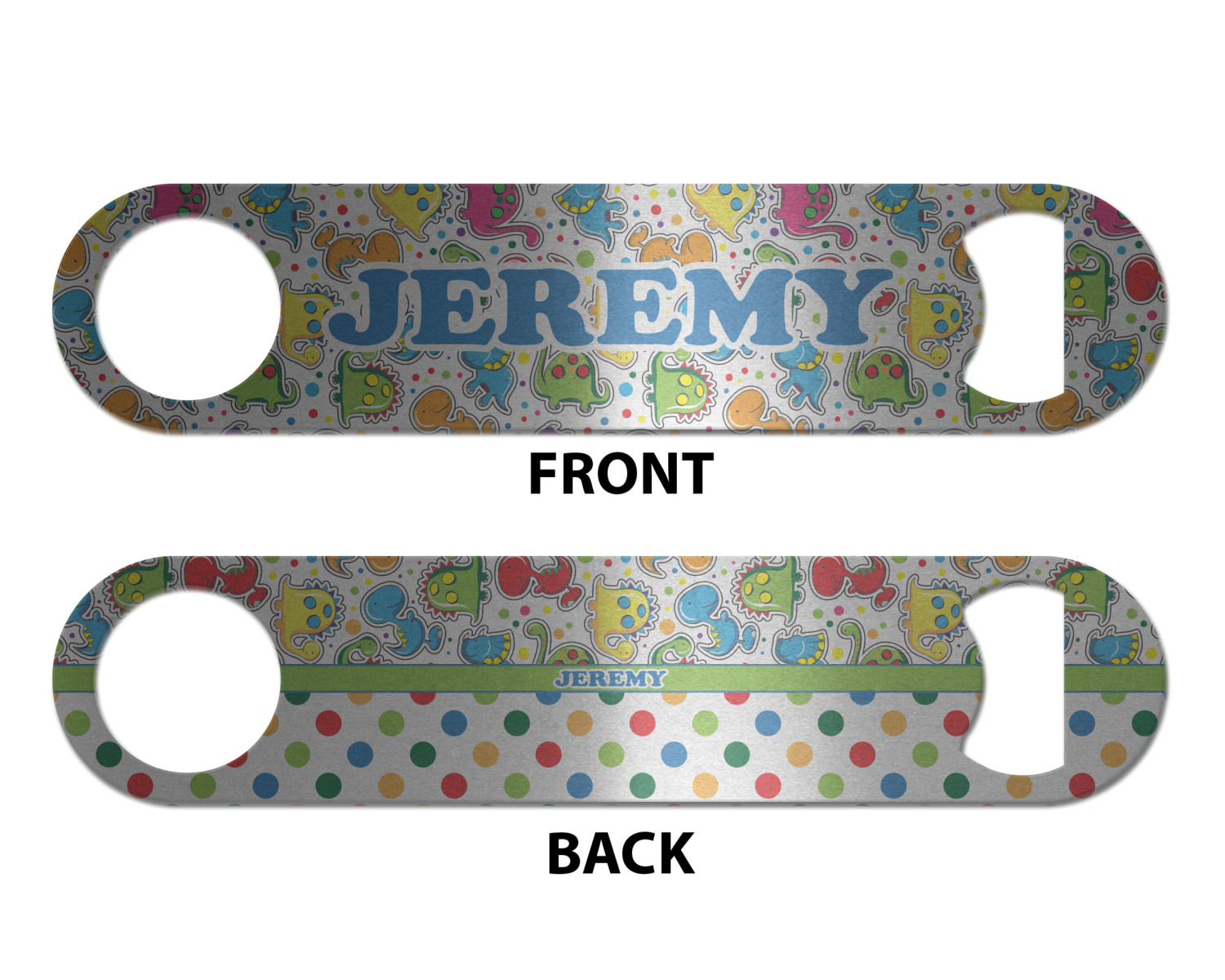 Made from stainless steel, these beer bottle openers are 7 by 1.625 inches, giving you plenty of leverage when trying to open a stubborn bottle. On one end of this personalized bottle opener, you'll find a circular hole for you to hang and display your opener. On the opposite end, you'll find the tool used for opening bottles. This opener in particular has the same structure and style as professional bartender bottle openers. Your customization is sublimated onto both the back and front, and both sides can be customized individually. Choose from one of our two base colors - white or silver.