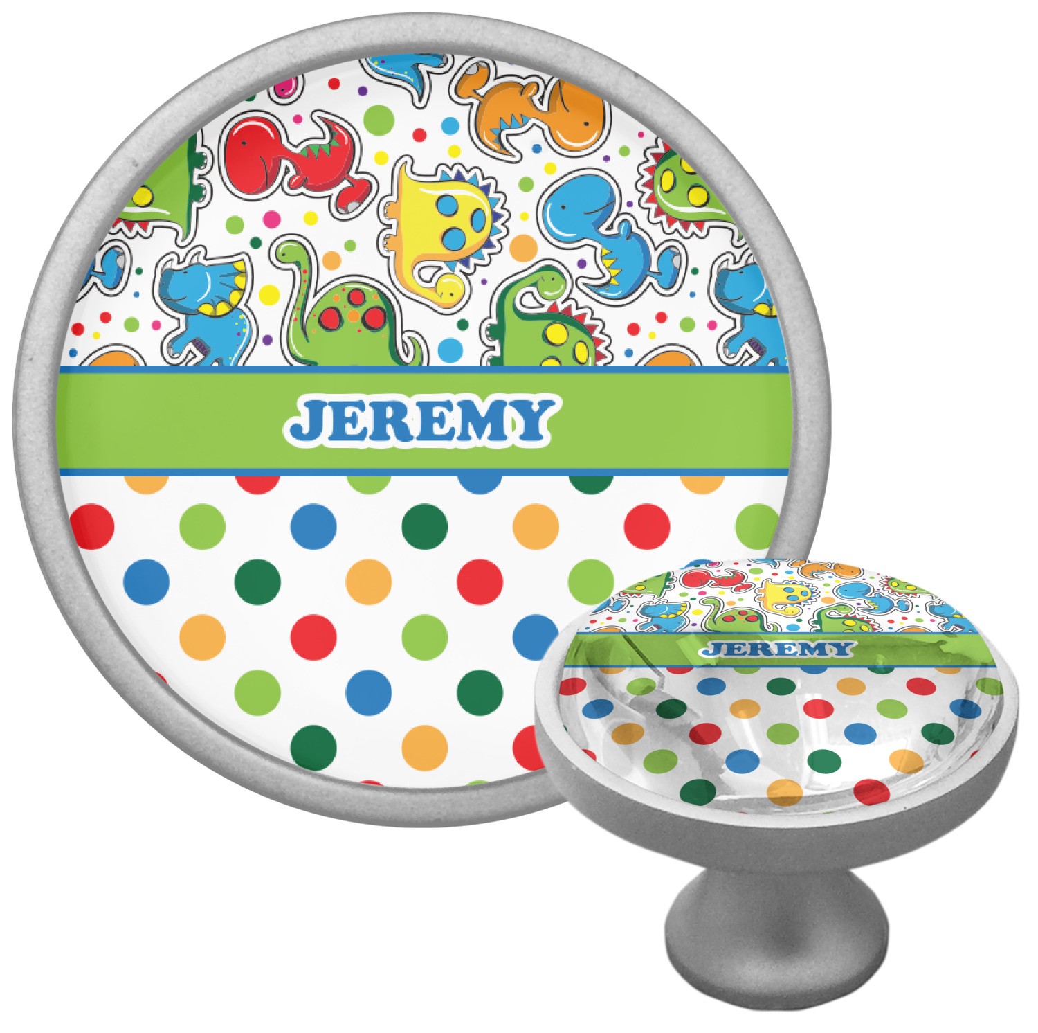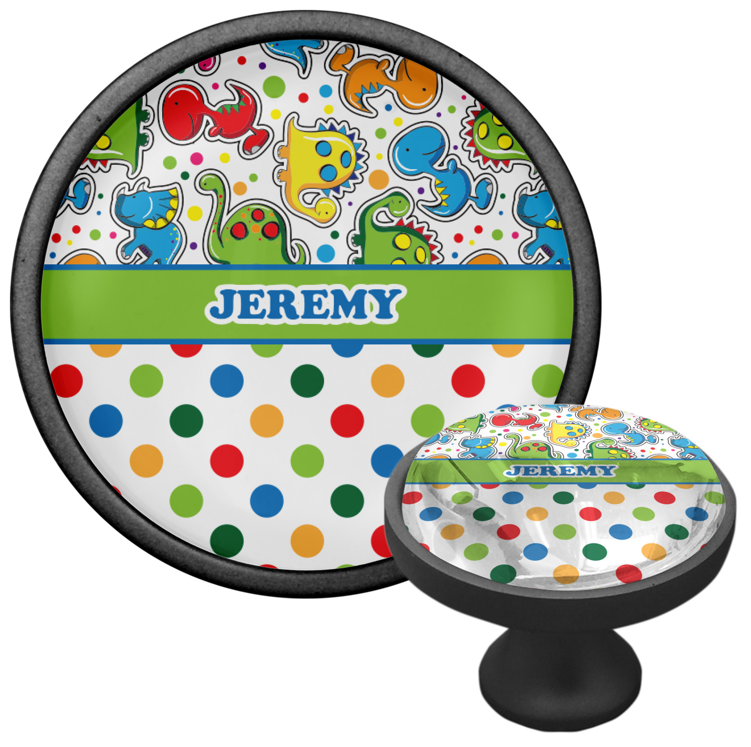 We sell these cabinet pulls in two different colors to better match your room's color scheme. We offer an oil-rubbed bronze base that is black in color, and a satin nickel option, which has a silver color. Your design is displayed across a high gloss vinyl insert that is placed on top of these cabinet handles. We then place a 1 inch thick glass cabochon atop the design, which seals the cabinet knob and makes the colors of your customization stand out. These custom cabinet knobs are approximately 1.3 inches in diameter. Your purchase includes a 1 inch screw that can be used to mount the knob to any cabinet in your home.