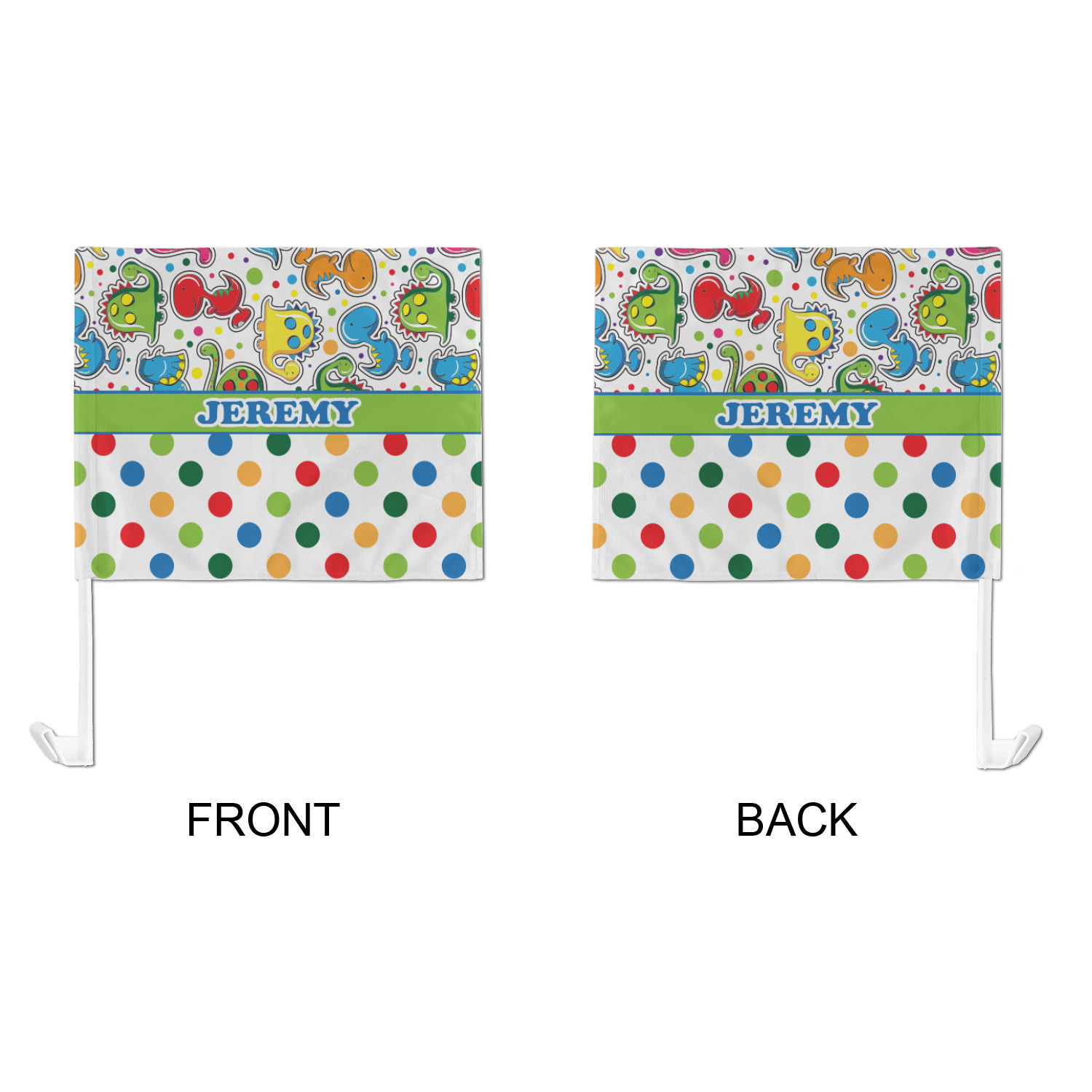 Our personalized flags are made from a durable, yet lightweight cloth that will proudly bear your logo or design of choice, while withstanding the outside elements. We have two size options - 8" x 11" and 11" x 15". Both come with a flag pole which includes a clip that secures the pole to the side window, whether it is rolled up or down. The flags are printed on both sides to display your design from all directions.