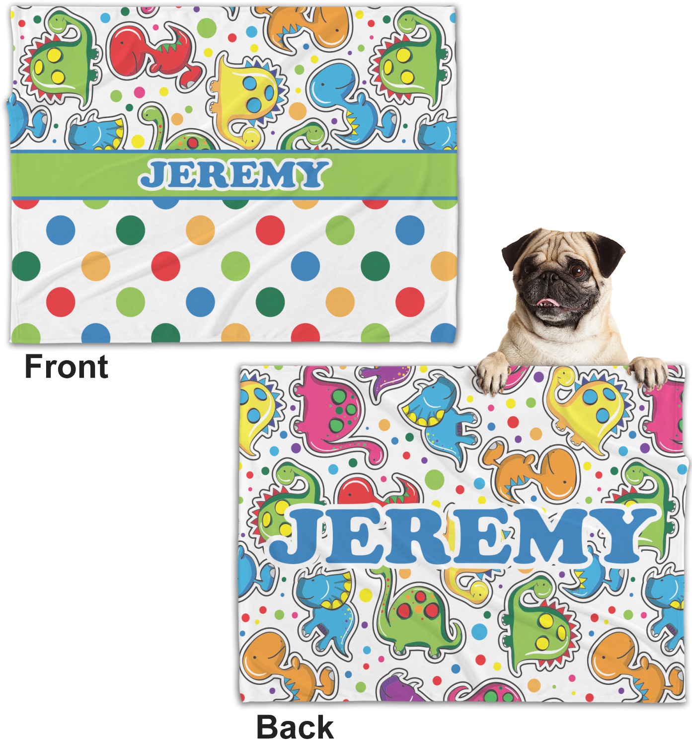 These dog blankets are crafted from a gentle, soft-to-the-touch, minky material. We print your customizations, either matching or differing, on both the top and underside of the blanket. These personalized dog blankets are available in two sizes: regular and large. Our regular size, at 40" x 30", accommodates small and some medium size dogs. At 60" x 50", our large dog blanket is a better fit for bigger breeds. Though specialized for dogs, these blankets still make a thoughtful gift for your favorite feline, or any other pet in mind!