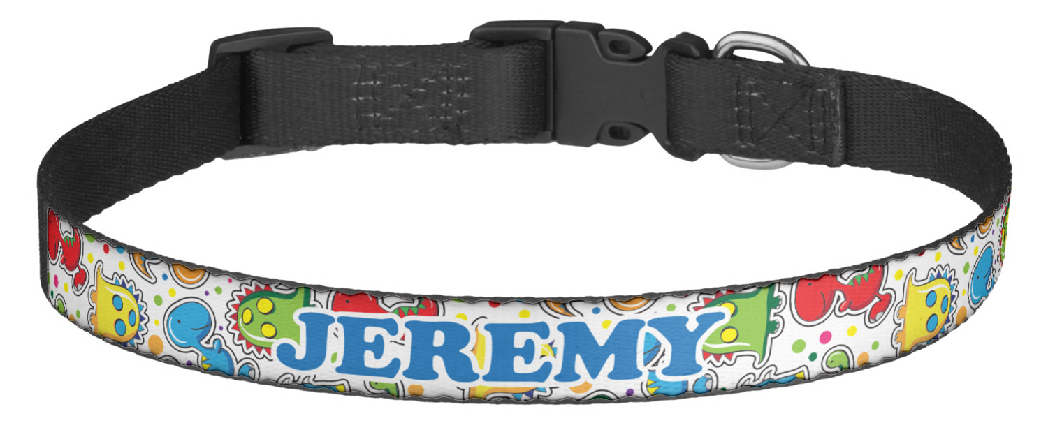 This sturdy collar, made from a durable nylon weave, will outlive your dog's episodes of excited tugging and pulling. Courtesy of its thick plastic buckle and adjuster, this collar is adjustable and accommodating of any dog. Structurally, the collar is a single piece of nylon weave that is sewn together, and features a solid metal loop where you can attach a leash or dog tag. We print and display your dog's name and pattern across the middle of the personalized dog collar.