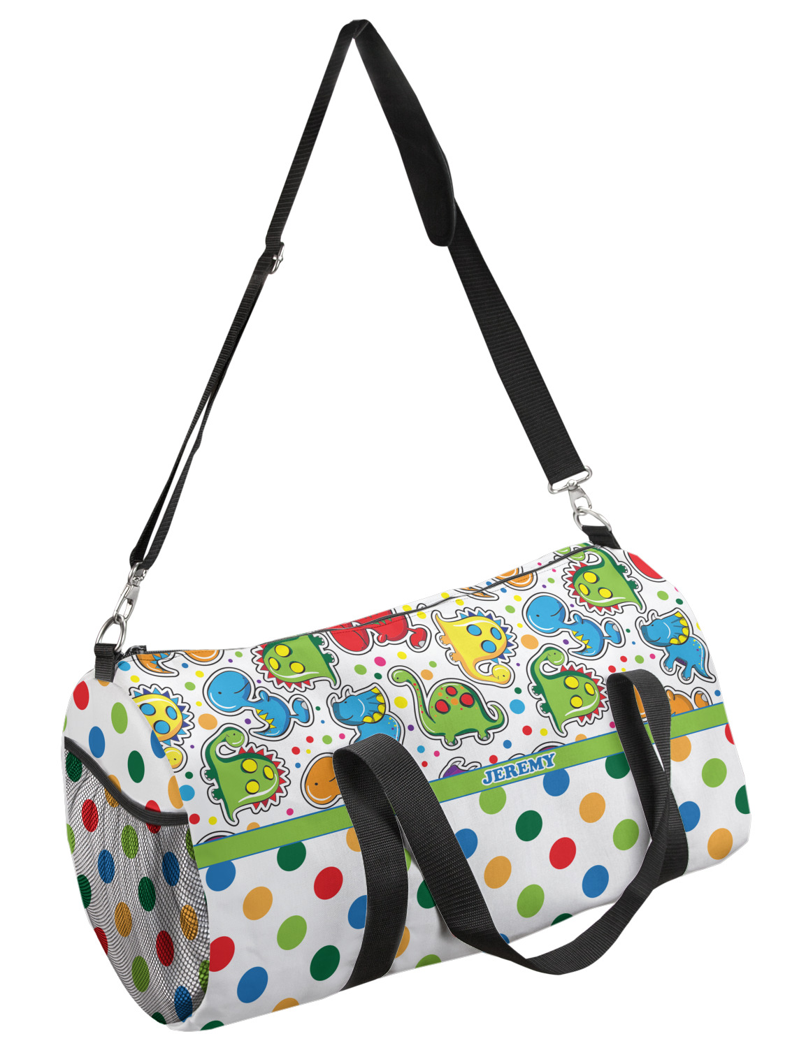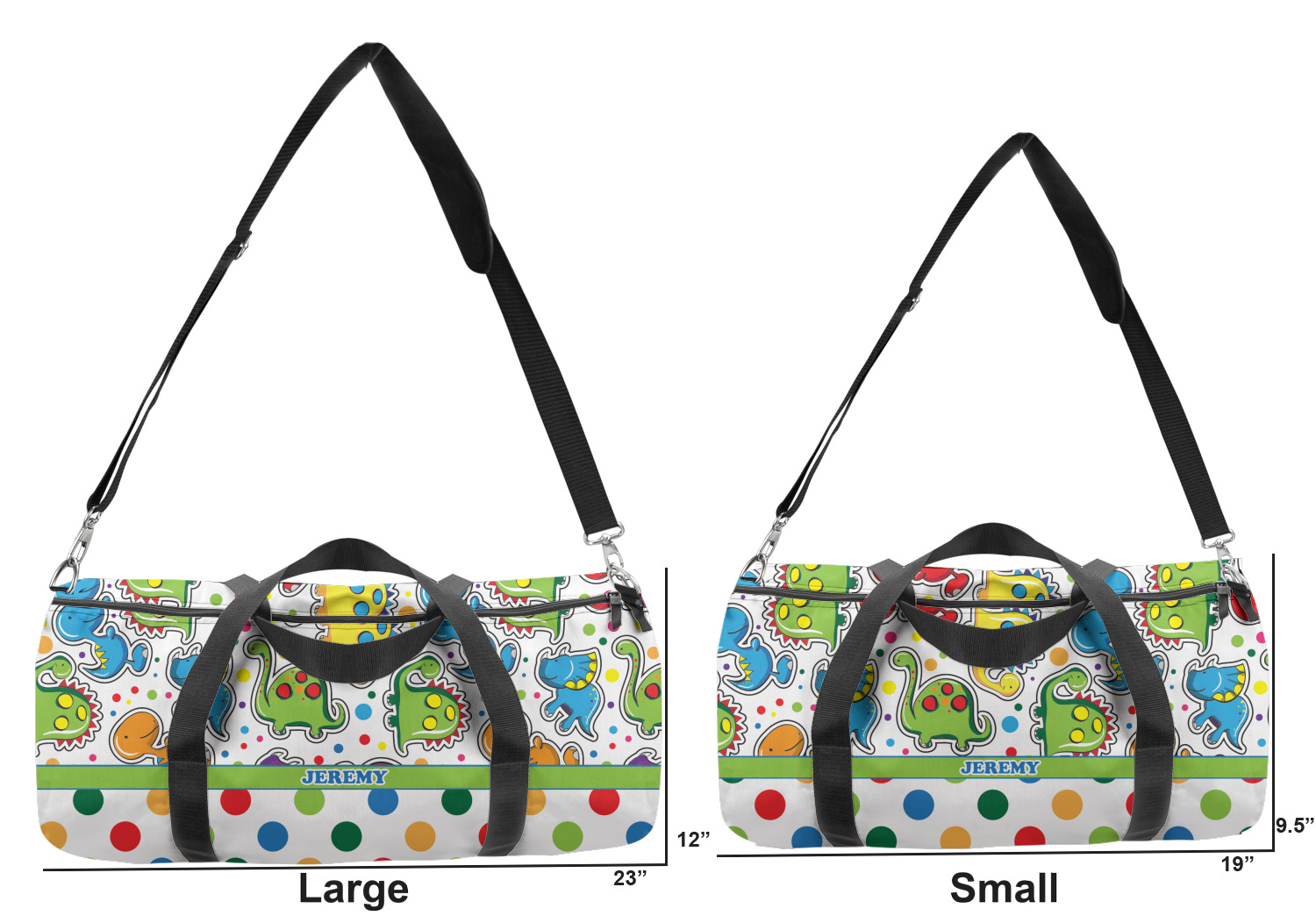 This duffle is a sturdy bag made of a canvas material. It comes in two sizes: Small (19"W x 9.5"H x 9.5"D) and Large (23"W x 12"H x 12"D). The bag is a cylindrical shape with a black adjustable strap and two handles. On one side is an elastic pouch to put a waterbottle or other small item. Your product will be sublimated with your design and is able to be designed on the front, back, and sides. Be sure to remember that the straps may cut into parts of your design if you upload your own artwork.