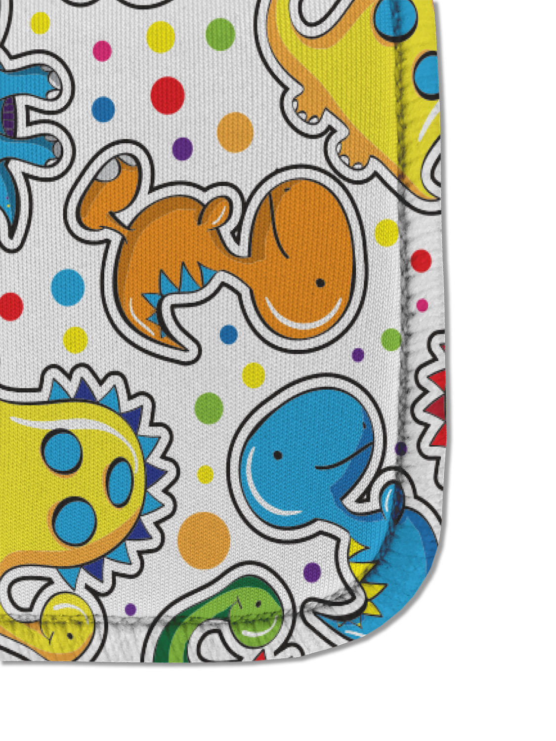 Colorful dinosaurs spring to life in this whimsical and comical versatile pattern. Set on a backdrop of multicolored polka dots these dinosaurs are sure to delight your little ones. Using bright colors of Blue, red, green, purple, yellow, and pink these dinosaurs are sure to stir up your little one's imagination in no time. The bottom of the design uses the same polka dot pattern, they just grew a little bigger.