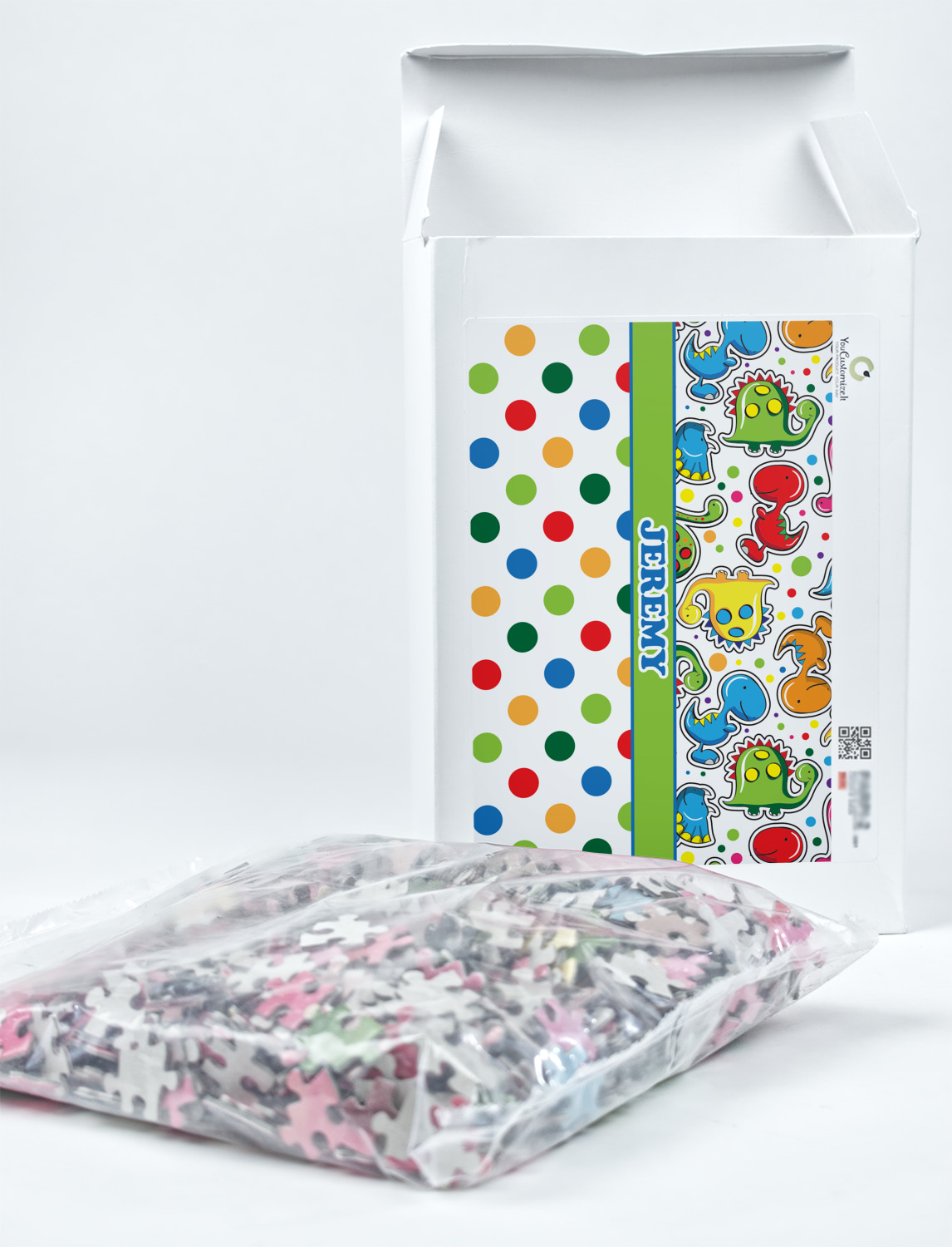 You can also upload your logo or art that you or your kids drew. To create more challenging jigsaw puzzles, you can create a pattern from with your logo or artwork. You can also add other elements such as text or personalization.