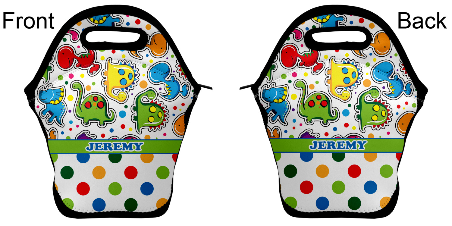Our personalized lunch bags are made from a strong neoprene, and secure with a zipper closure that lines the top of the bag.The edges of the neoprene are sewn together with a heavy duty stitch, adding to the durability of the bag. The is accompanied by a reinforced handle at its top, for the easy transport of your lunch. We display your personalization across both the front and back of this neoprene lunch bag, while the remaining sides are a sleek black in color. Each bag measures at 13.5 inches tall, and 11.5 inches wide.