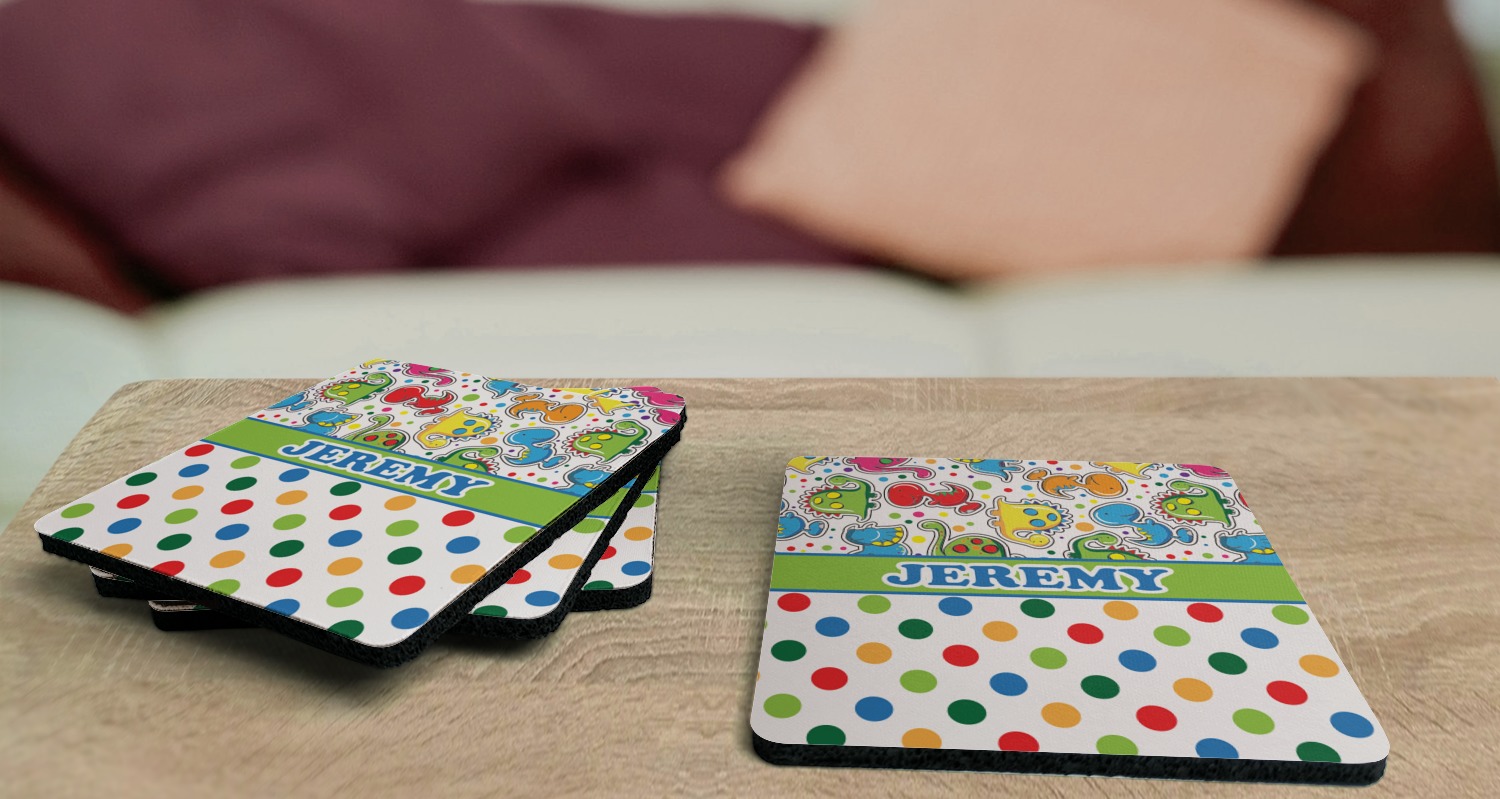 These drink coasters have a smooth, polyester top and a textured, rubber backing on its bottom. The non-slip rubber backing underneath works to keep any spills at bay. At 4 by 4 by 0.25 inches thick, these custom coasters are a suitable size for most drinkware. Your personalization is displayed atop the face of the cup coaster. We sell these rubber coasters in two different shapes: square and round. You can buy each shape as singulars or as a set of 4.