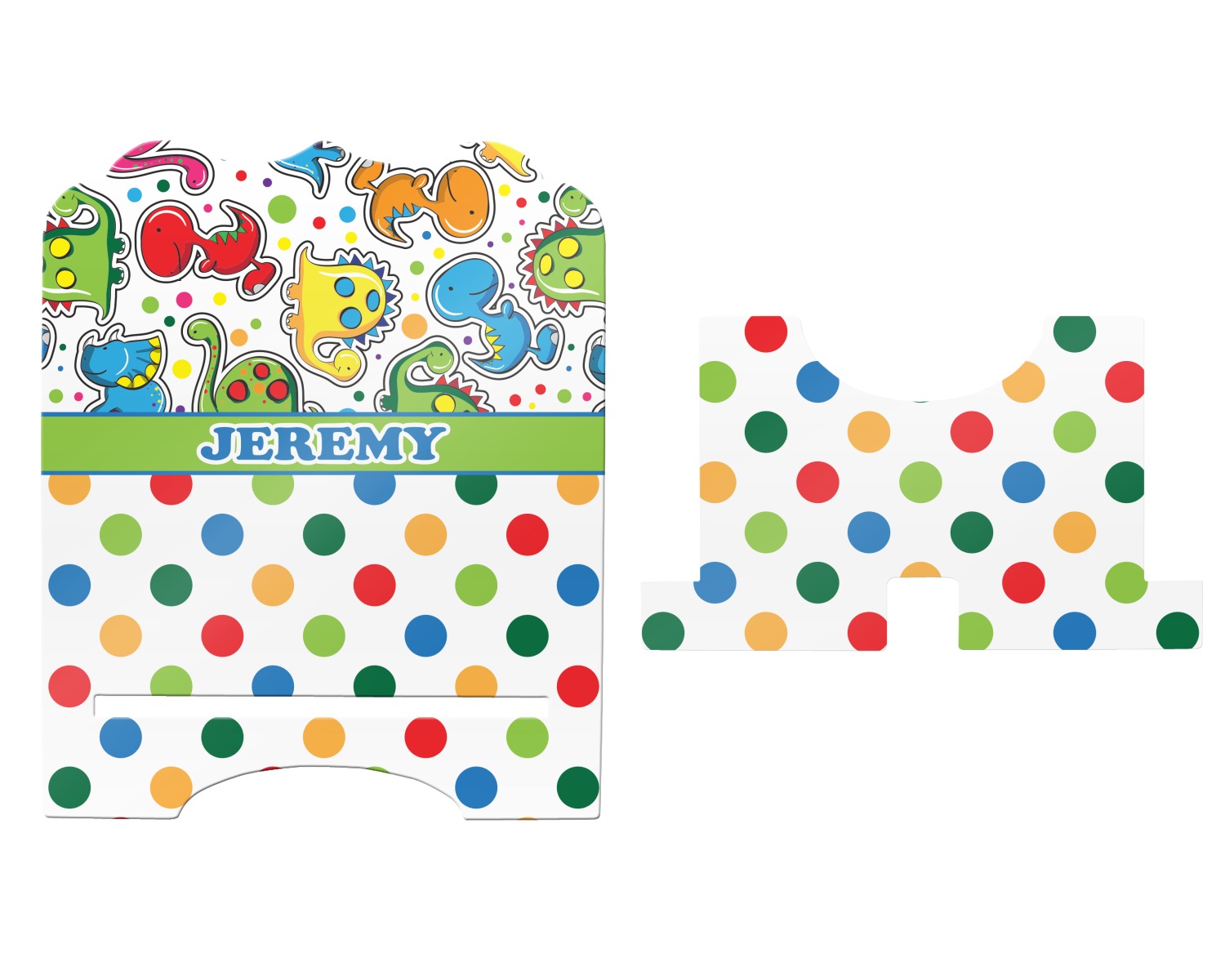 Colorful dinosaurs spring to life in this whimsical and comical versatile pattern. Set on a backdrop of multicolored polka dots these dinosaurs are sure to delight your little ones. Using bright colors of Blue, red, green, purple, yellow, and pink these dinosaurs are sure to stir up your little one's imagination in no time. The bottom of the design uses the same polka dot pattern, they just grew a little bigger.