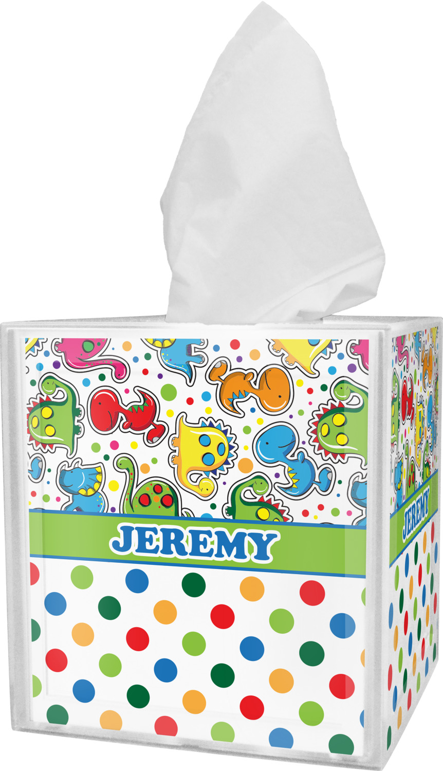 These tissue holders are built from durable acrylic and display your unique personalization on fine-quality vinyl inserts placed within the four sides and top. The box features two pieces, allowing you to easily switch out tissue boxes. On the sides, youll find ridges that ensure the top and base fit securely in place. The bottom of these tissue box holders has four, rubber, non-slip pads to prevent the box from scuffing any surface you decide to display it on. Each box can fit a standard 5 by 5-inch box of tissues.