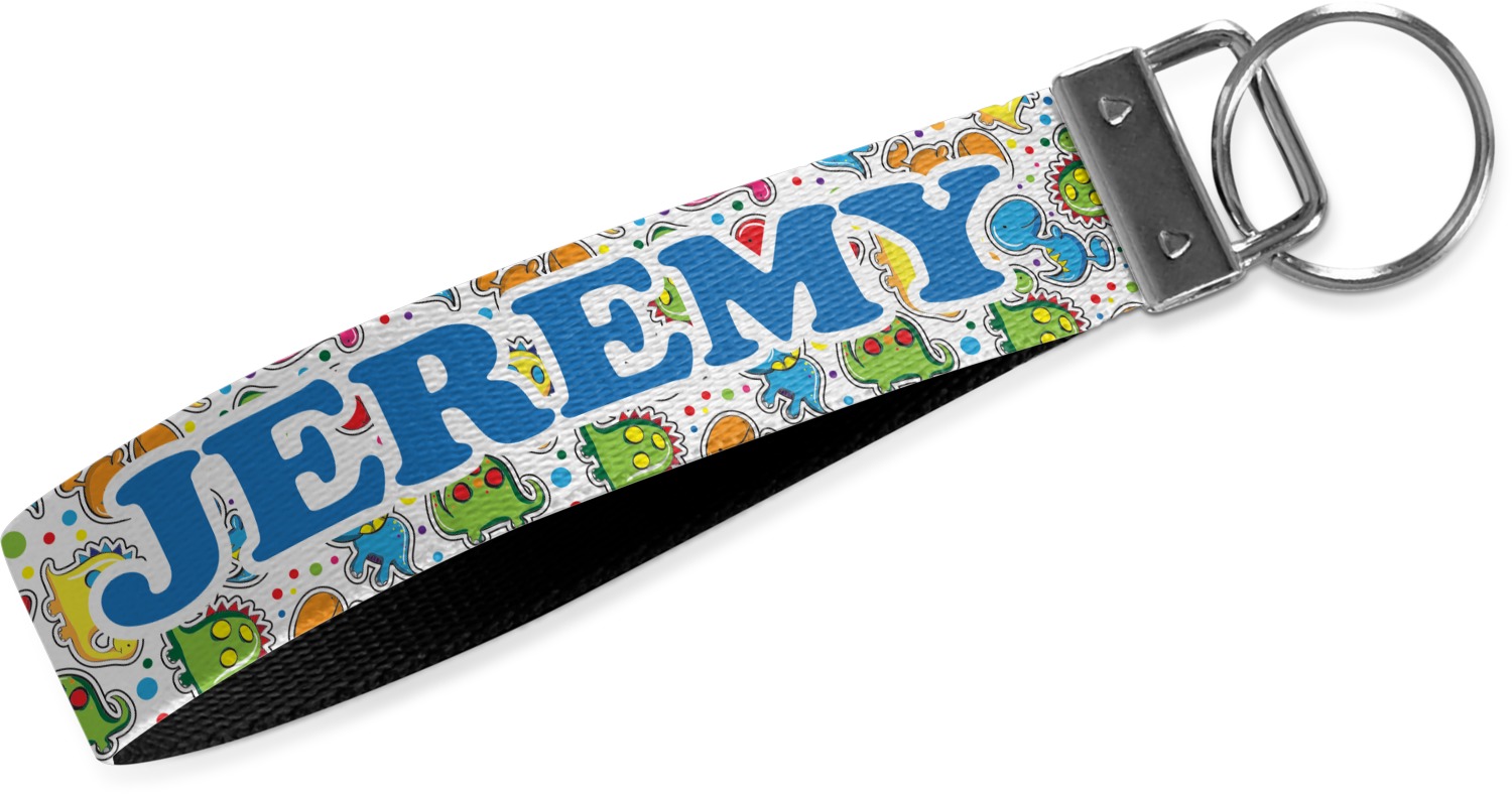 These key fob keychains are made from a polyester weave, right here in the USA. They feature a silver, metal clasp, attached to a round keyring. The piece gives the personalized wristlet a beautiful, finished look. Your customized design is printed on the outside of the keychain strap. We carry these wristlets in two sizes: small, which is 5 inches in width, and large, which is 5.5 inches in width.