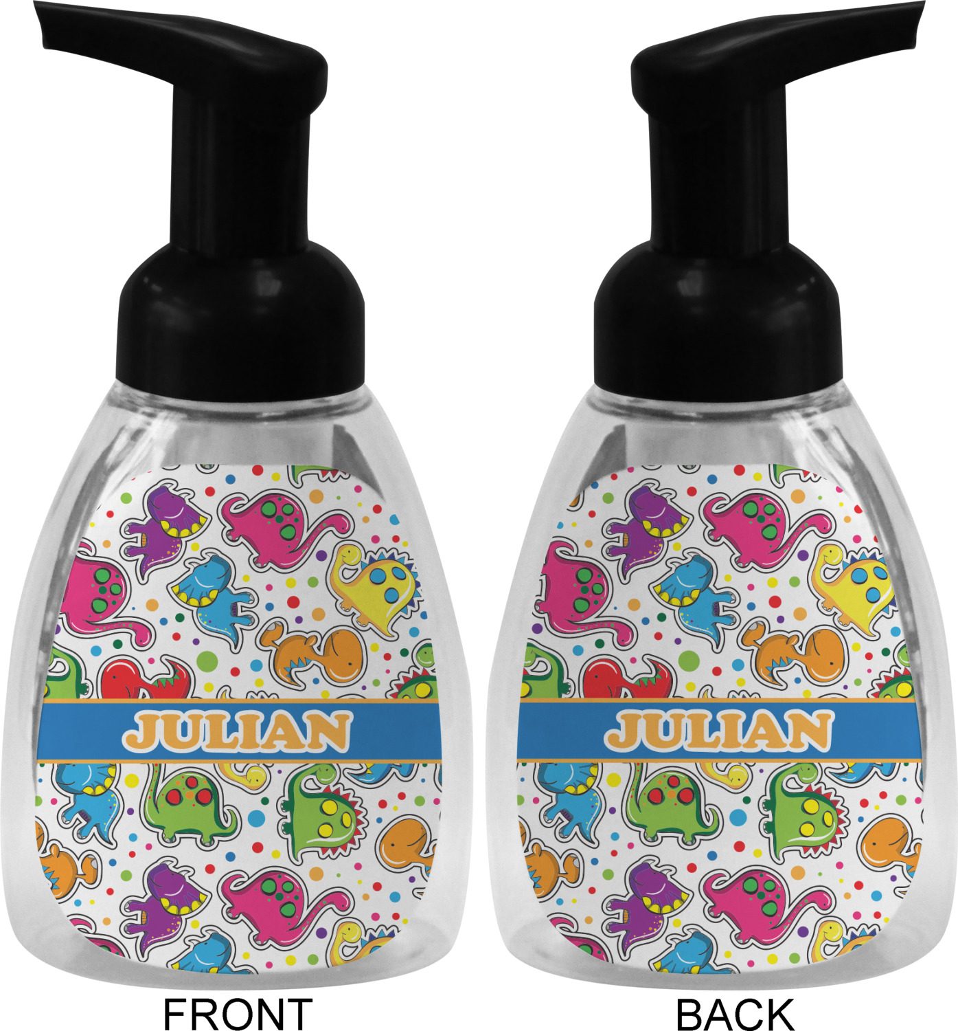 This soap dispenser is made of a robust plastic and has a clear base. The included soap pump is available in black or white color. This dispenser is 6.5 inches tall, 3 inches wide, and 2 inches deep. We display your customized designs on the front and back sides of these foaming hand soap dispensers.