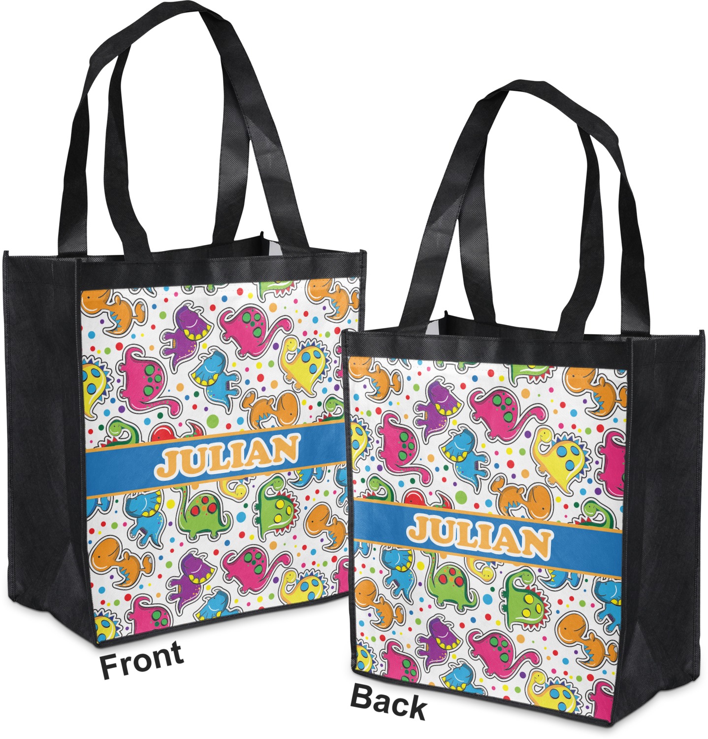 Made from a durable, biodegradable material, these reusable shopping bags can support up to 30 pounds of weight. With two large handles, measuring at 8.5 inches each, these personalized tote bags are easy to carry to your vehicle or home. The bag itself is 12 by 13.5 inches, and can expand to a depth of 7 inches. Your customization is printed on both the front and back, while the remaining sides, trim, and handle are a sleek, charcoal black.