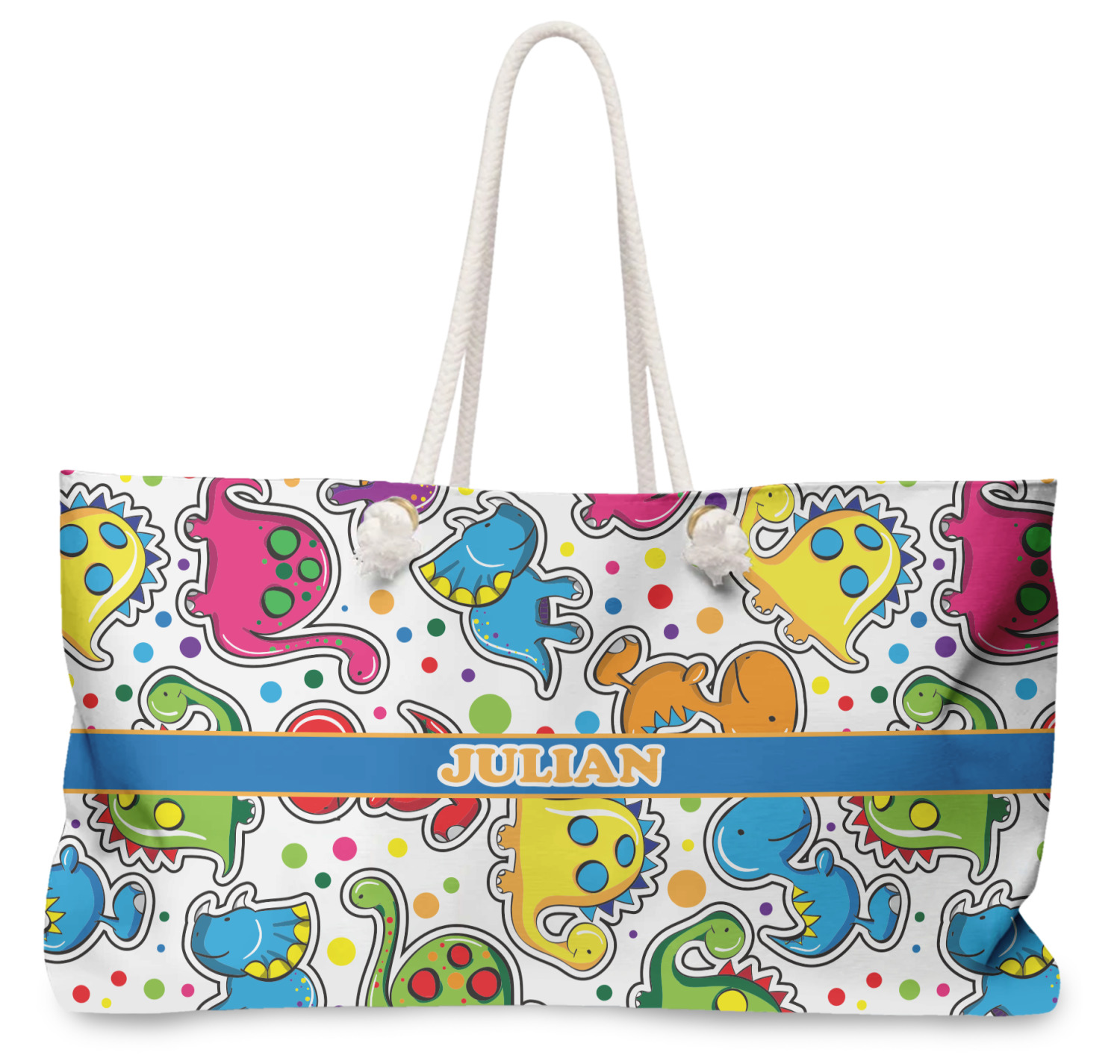 Our oversized weekender tote with rope handles is perfect for your weekend at the beach or on the town. This large tote are 24" W X 13" H, with a 5" gusset and a 27" thick rope handles with a knot that is put through a grommeted brass hole.