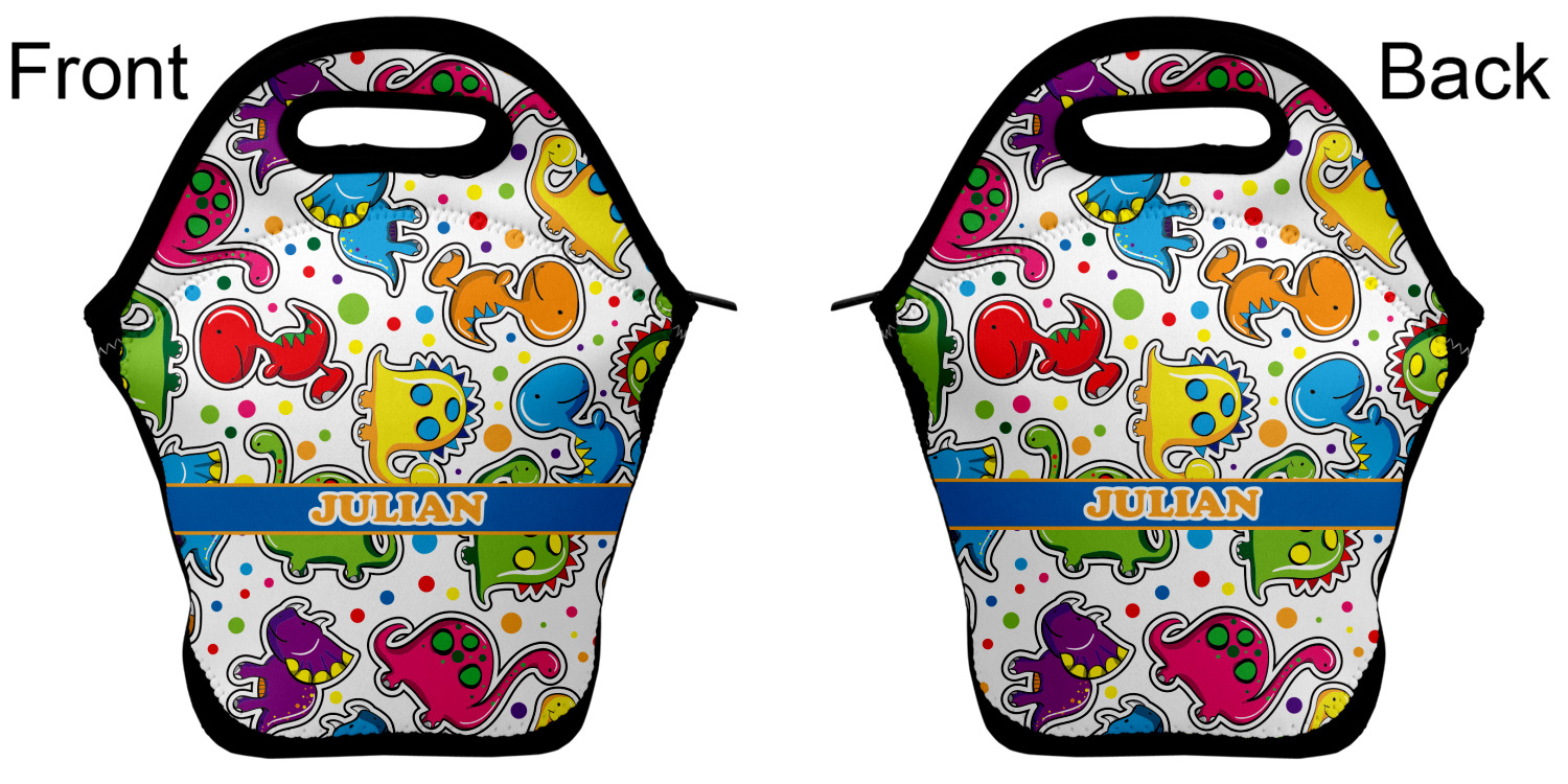 Our personalized lunch bags are made from a strong neoprene, and secure with a zipper closure that lines the top of the bag.The edges of the neoprene are sewn together with a heavy duty stitch, adding to the durability of the bag. The is accompanied by a reinforced handle at its top, for the easy transport of your lunch. We display your personalization across both the front and back of this neoprene lunch bag, while the remaining sides are a sleek black in color. Each bag measures at 13.5 inches tall, and 11.5 inches wide.