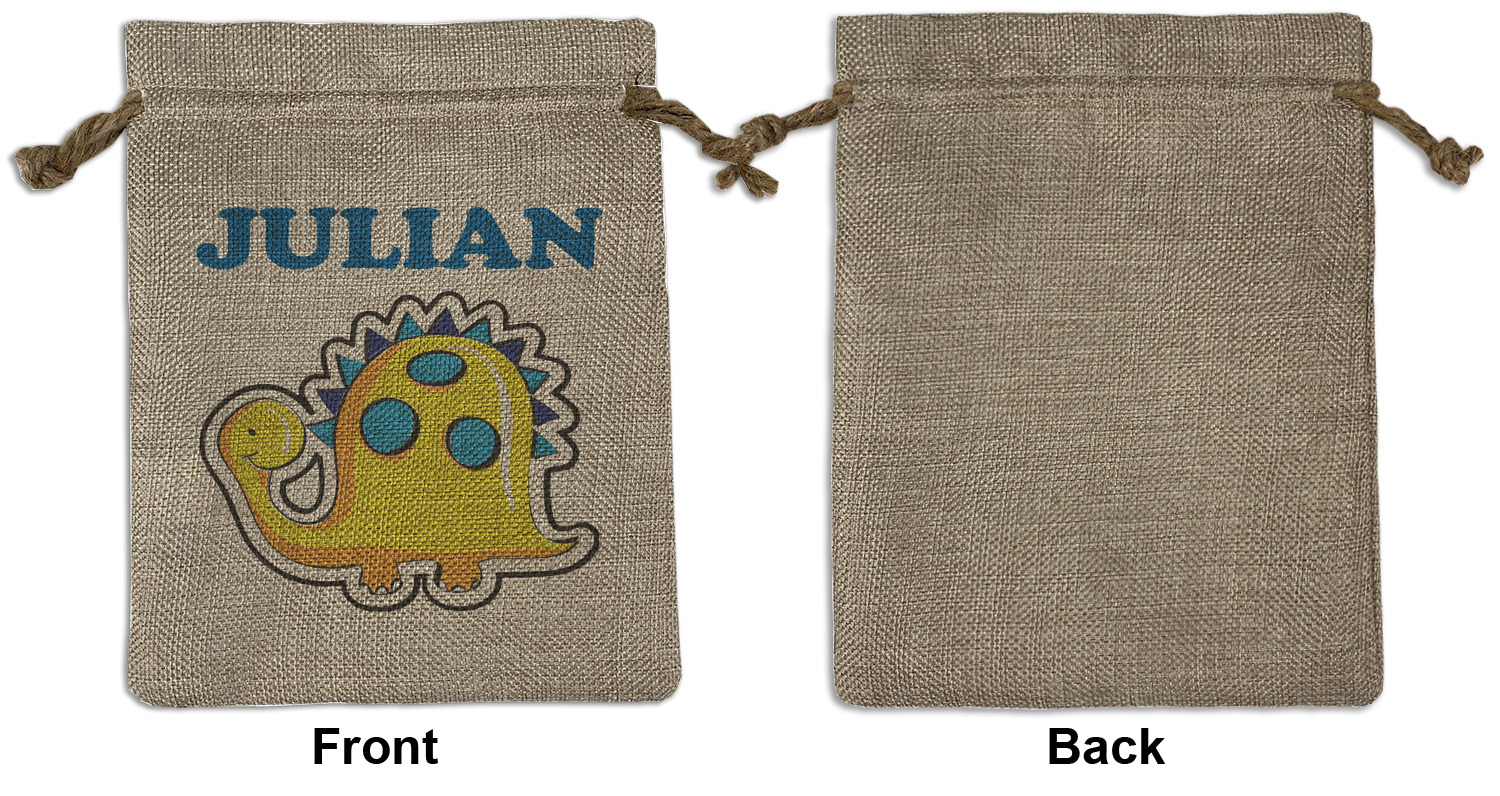We sell our Burlap Gift Bags in 3 variant sized bags. Made with burlap polyester, each personalized bag can be secured with a twine drawstring pull. Your custom design is available to print on one side or both sides - completely up to you! The sizes of the bags measure approximately 4.5" x 6.5" for the smallest size, 6.5" x 8.0" for the medium size, and 6.5" x 13.5" for the large-sized bag.
