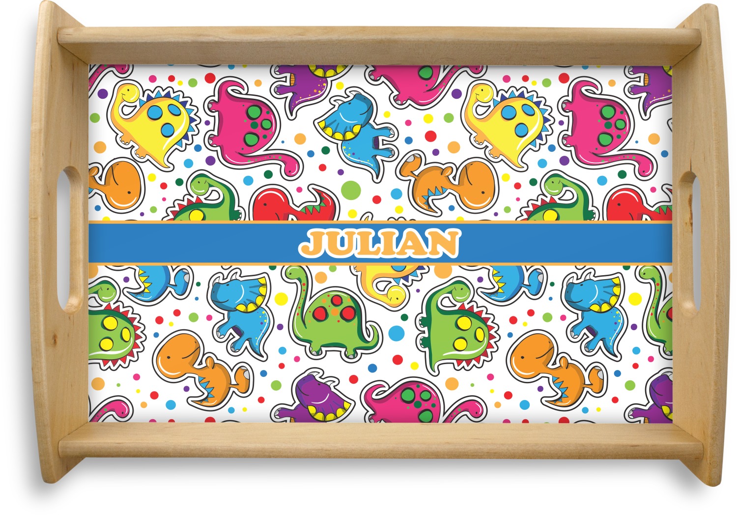 This serving tray with handles features square edges and two rounded sides, creating a very modern look. Each side is fabricated from a beautifully cut, natural wood. The bottom of the interior of the tray displays your customized design in bright, vibrant color. The tray is sold in both a black color and a natural wood look. Each variation of the wood serving tray has two sizes: Small, which is 14" x 10" x 2.25", and Large, which is 19.5" x 13.5" x 2.75".