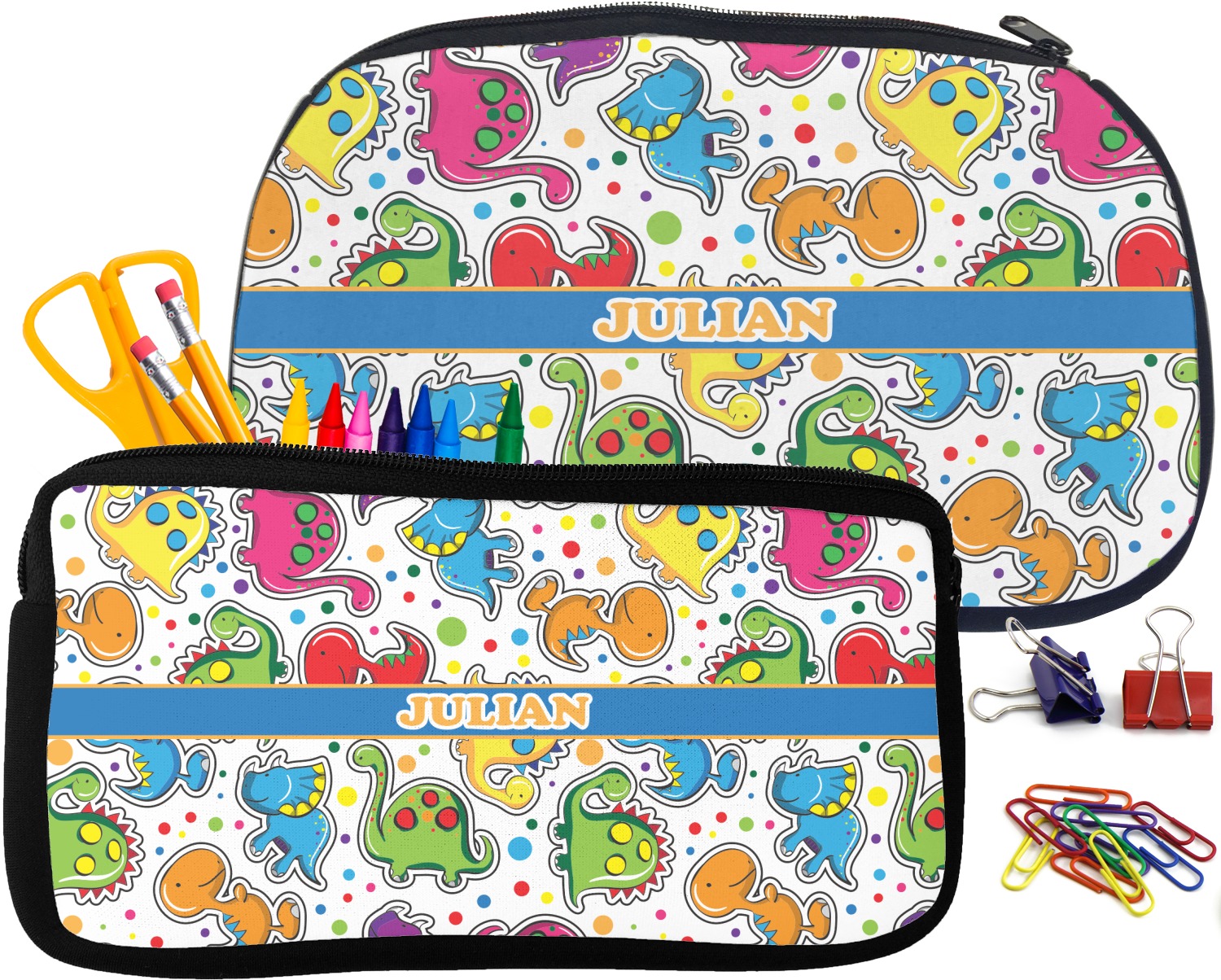 Built from durable neoprene, these pencil pouches, are water resistant, and prevent leaking ink from spilling into your backpack or purse. These custom pencil cases secure with a robust, black zipper. We print your personalized design on the front of this pouch, while the remaining sides a simple black color. These colored pencil cases [880] are sold in two sizes; our smaller version measures at 8.5 by 4.5 inches, while the medium measures at 10.5 by 6.5 inches. The smaller size is more suitable for holding pencils and pens, while our medium size can accommodate pencil sharpeners, scissors, and erasers.