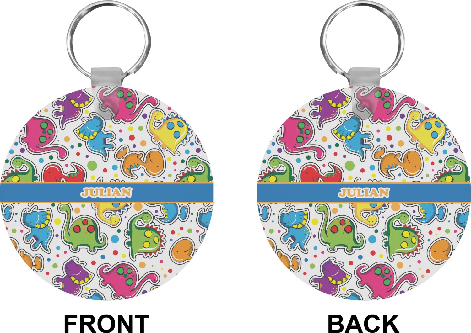 Our personalized keychains attach to the included metal, split key ring with a plastic, removable snap. Since a metal ring is included with your purchase, you have the liberty to keep your keys together on the ring, with or without your unique keychain. We offer this keychain in three different shapes: circle, heart, or diamond. We print your personalized design(s) on both sides of the key chain, and the surface has a glossy, reflective finish that only emphasizes your design. Each keychain is approximately 2.25 by 2.25 inches.