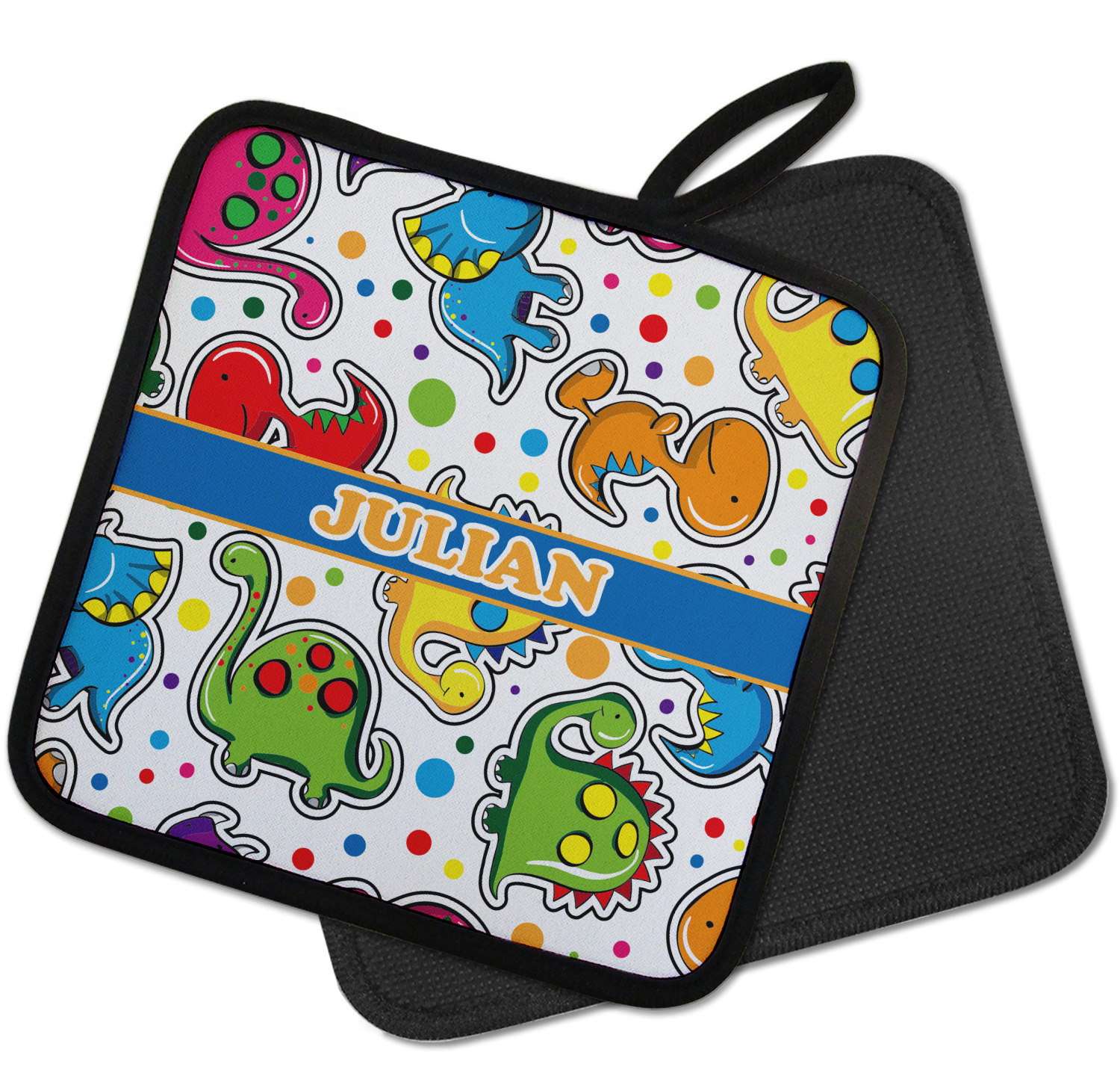 Our personalized pot holders feature a neoprene front that displays your personalization in vibrant colors. The backing of the hot pot holder is rubberized; the textured backing allows you to have a great grip when using this custom pot holder. The two materials are joined with a sleek, black trim, and the holder also includes an attached loop for hanging and storage. The pot holder is approximately 8.75 inches by 8.75 inches and 0.25 inches tall, while the fabric loop is 2.5 inches long. You can purchase a kitchen pot holder by itself or as a set of 2. We also offer a set including one pot holder and one oven mitt.