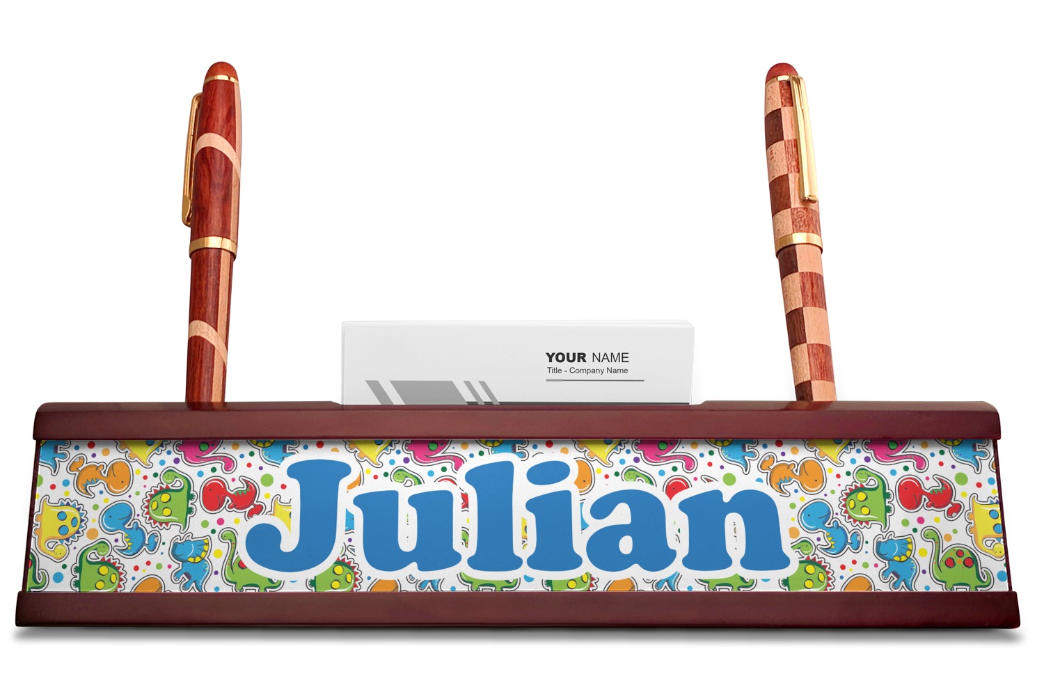 Your desk name plates are crafted from a high-quality, dark-cherry mahogany. At approximately 9.5 by 1.875 by 2.5 inches, this name plaque will fit perfectly, front and center, on your desk. Your customization spans across the entire face of the nameplate. Behind the nameplate lies a skinny slot that can fit approximately 15, traditionally-sized, business cards. You can also store your writing utensils on either side of this custom desk name plate.