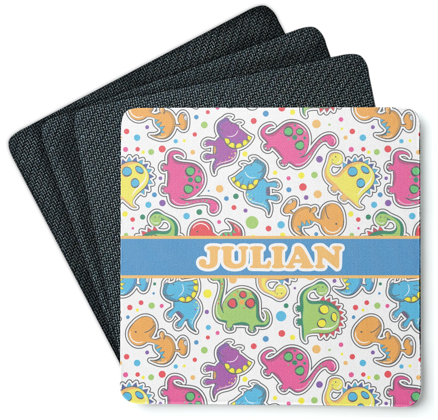These drink coasters have a smooth, polyester top and a textured, rubber backing on its bottom. The non-slip rubber backing underneath works to keep any spills at bay. At 4 by 4 by 0.25 inches thick, these custom coasters are a suitable size for most drinkware. Your personalization is displayed atop the face of the cup coaster. We sell these rubber coasters in two different shapes: square and round. You can buy each shape as singulars or as a set of 4.