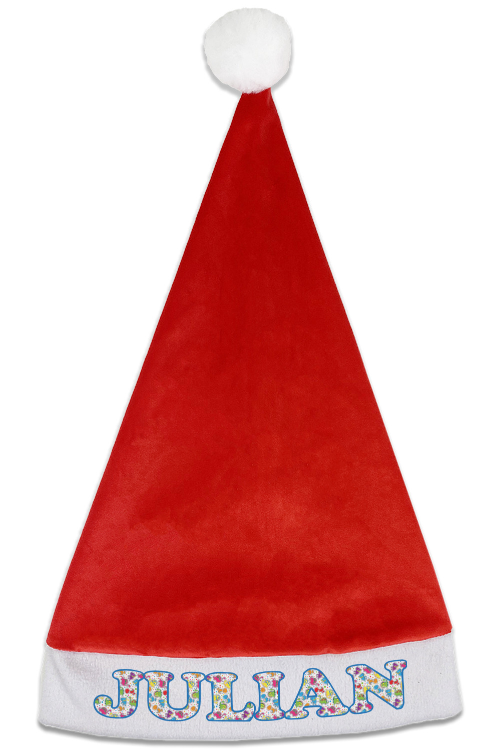 Our Santa hats are a soft, velvety polyester material. These customizable Santa hats are a classic red with white brimming and pom pom ball hanging off the hat tail just like Santa Claus! Each personalized Santa hat is approximately 17.5 L x 11.8 W. We offer two different styles to print your designs on the white brim - front or front & back.