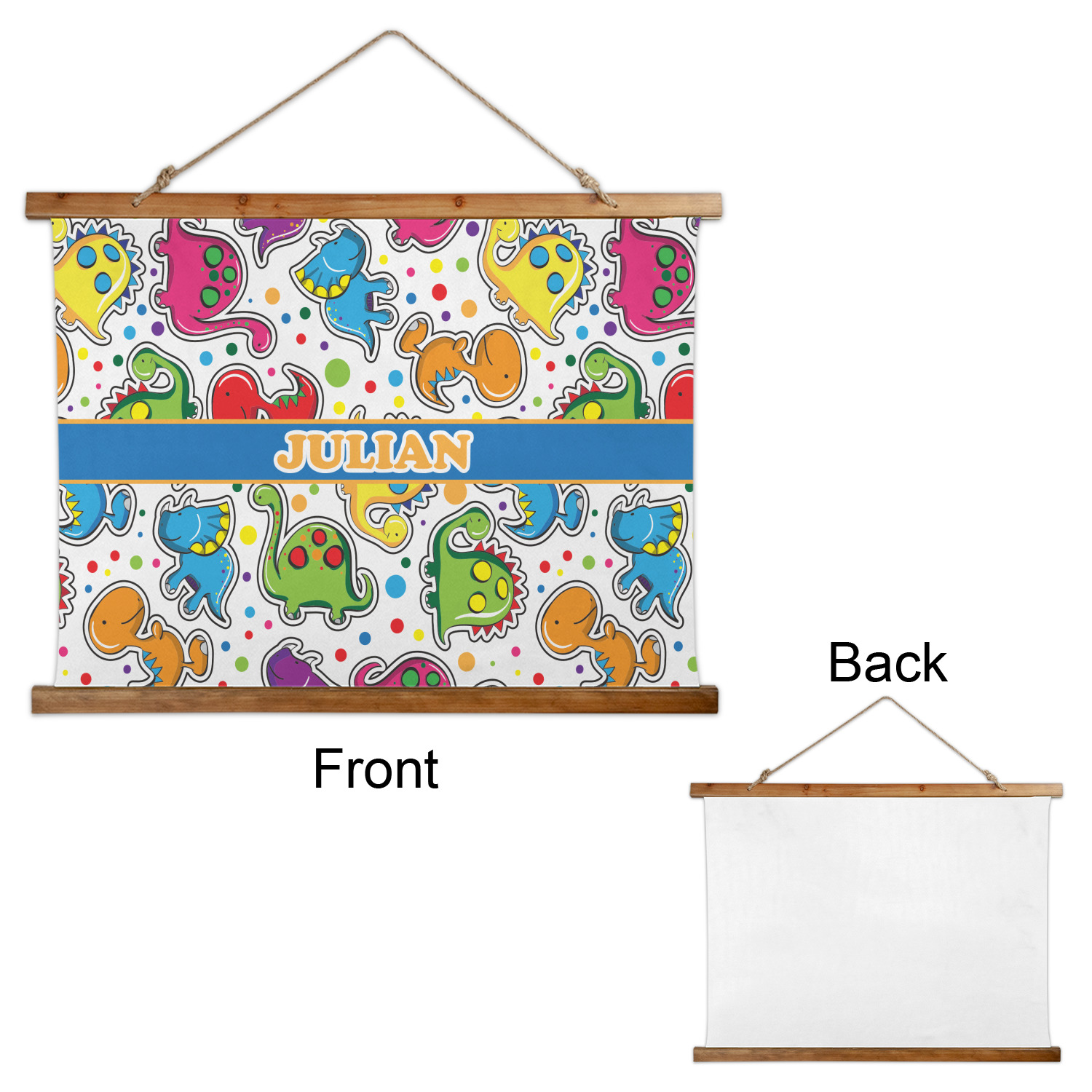 Made in two different orientations - portrait or landscape - both are 26" x 36". Your design is printed on a high quality polyester fabric with hemmed edges. The wood on the top and bottom of the tapestry is 1.25" tall and 0.25" thick and there are two pieces on top and bottom which sandwich the fabric.