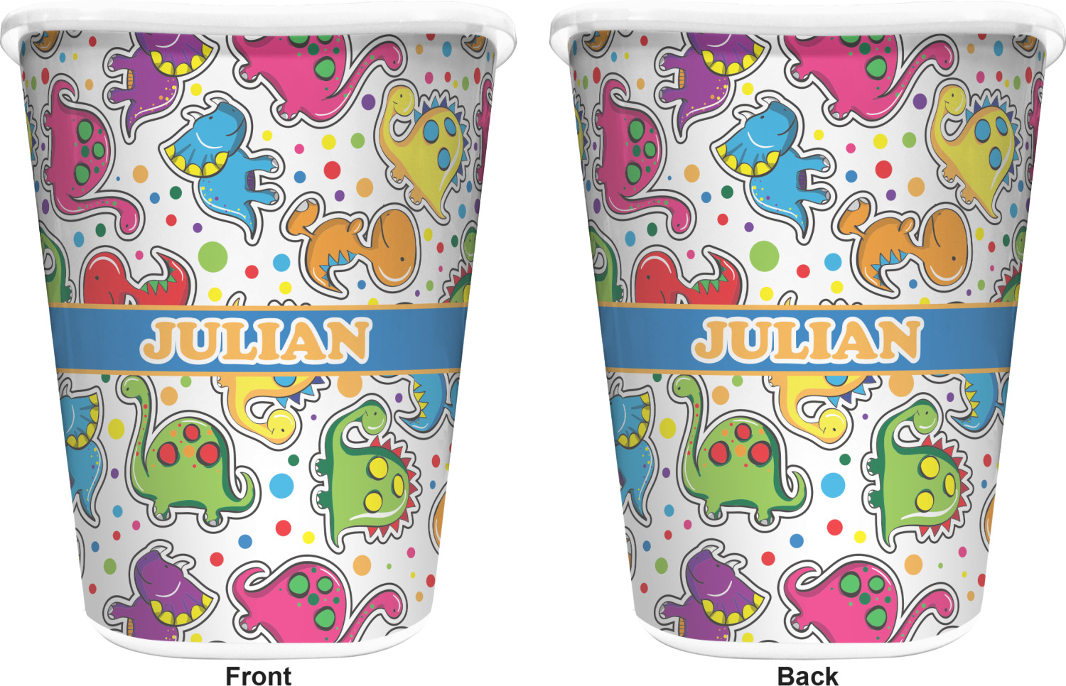 You can choose to purchase these decorative wastebaskets in either a white or a black color that will show on the base and the upper rim. Your customization is printed on a high-gloss, fine-quality vinyl adhesive, and you can choose to either have this adhesive applied to one side only or to both sides. As such, this plastic wastebasket can be single-sided or double-sided, depending on your creative vision. Your customization is printed using durable inks, making the design waterproof and resistant to fading over time.