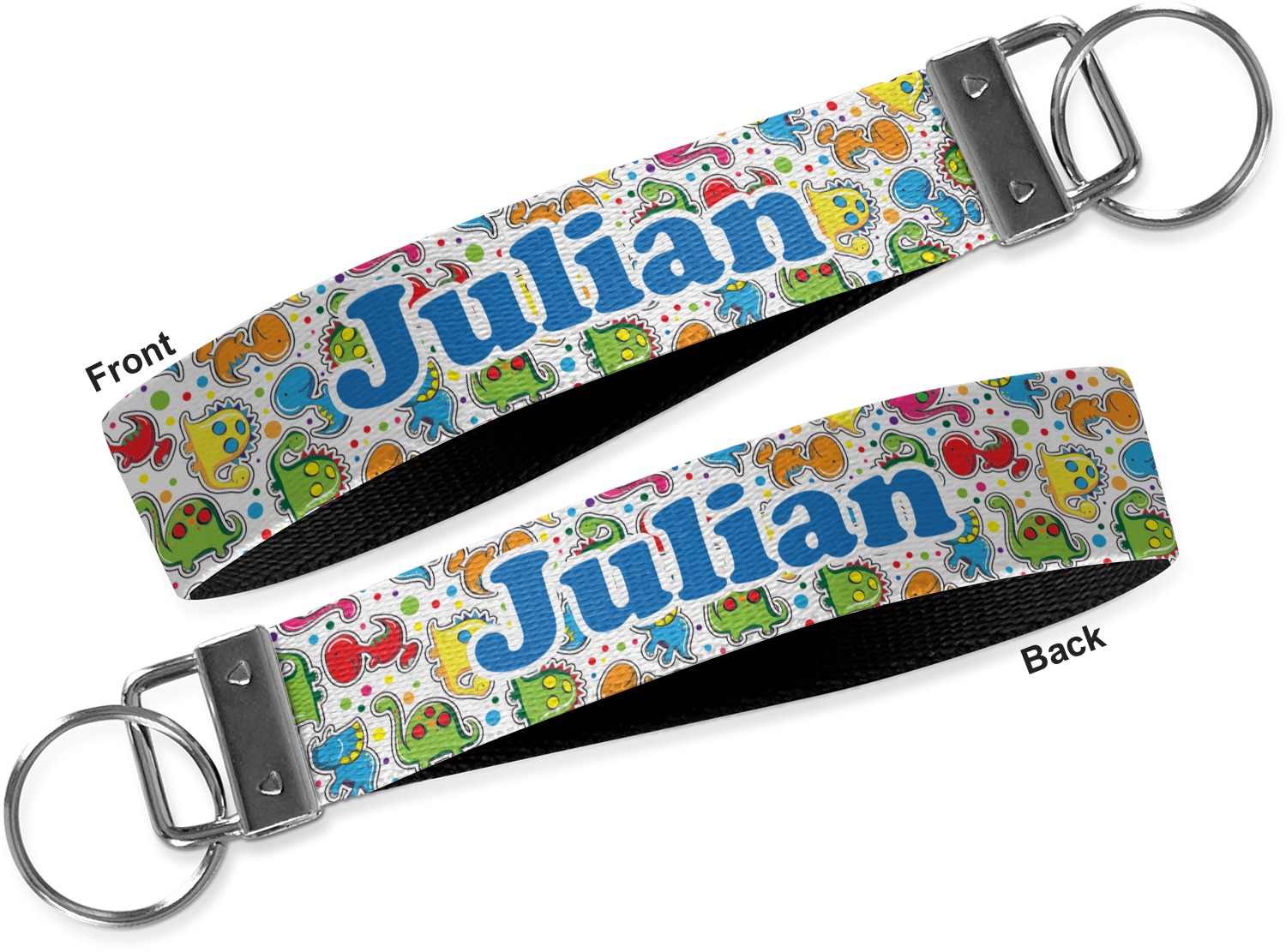 These key fob keychains are made from a polyester weave, right here in the USA. They feature a silver, metal clasp, attached to a round keyring. The piece gives the personalized wristlet a beautiful, finished look. Your customized design is printed on the outside of the keychain strap. We carry these wristlets in two sizes: small, which is 5 inches in width, and large, which is 5.5 inches in width.