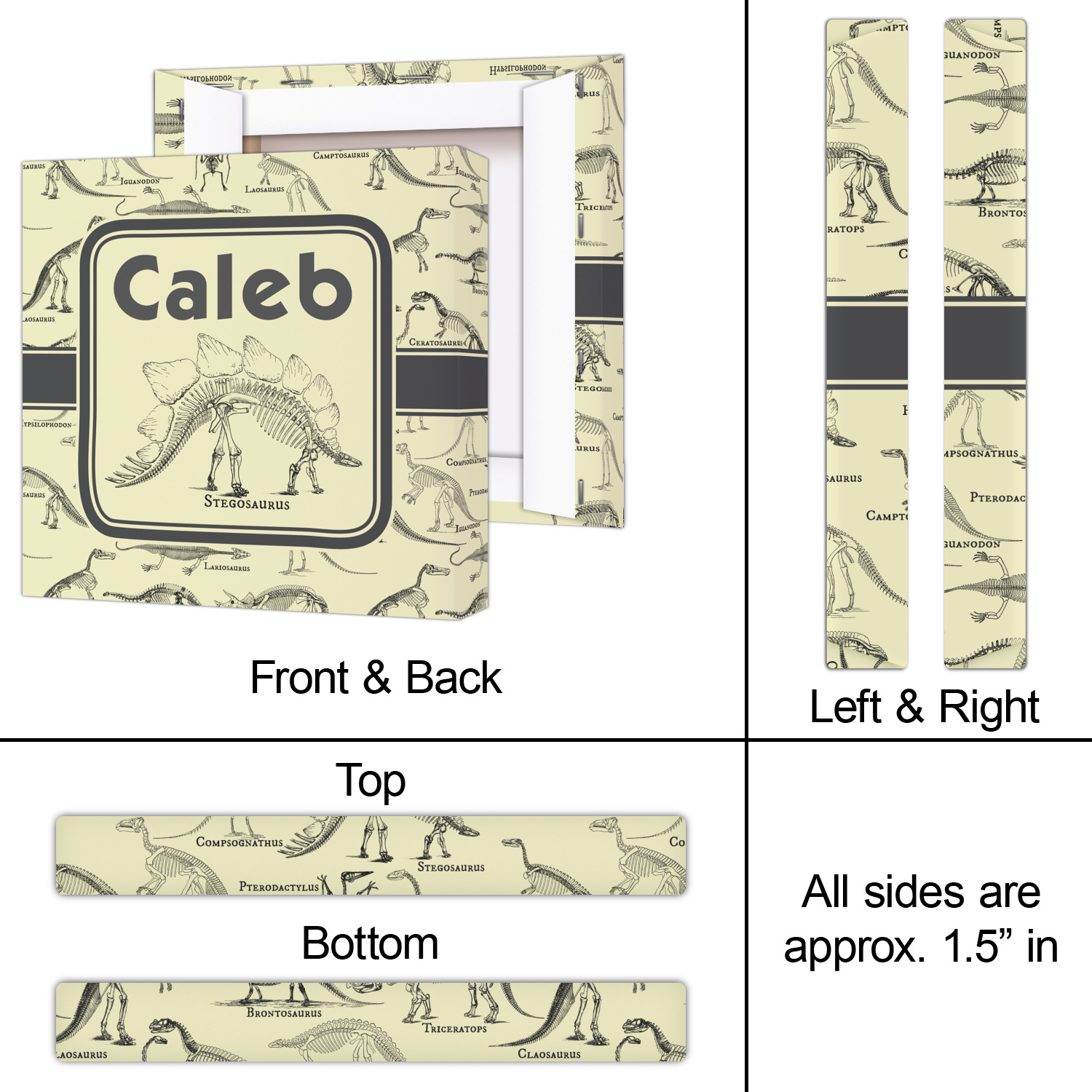 We chose to feature our design with a dark grey classic ribbon, a square label featuring the Stegosaurus Skeleton along with the child's name for personalization. All the Dinosaur Skeletons are available in our system - so you can your child's favorite dino and feature it.