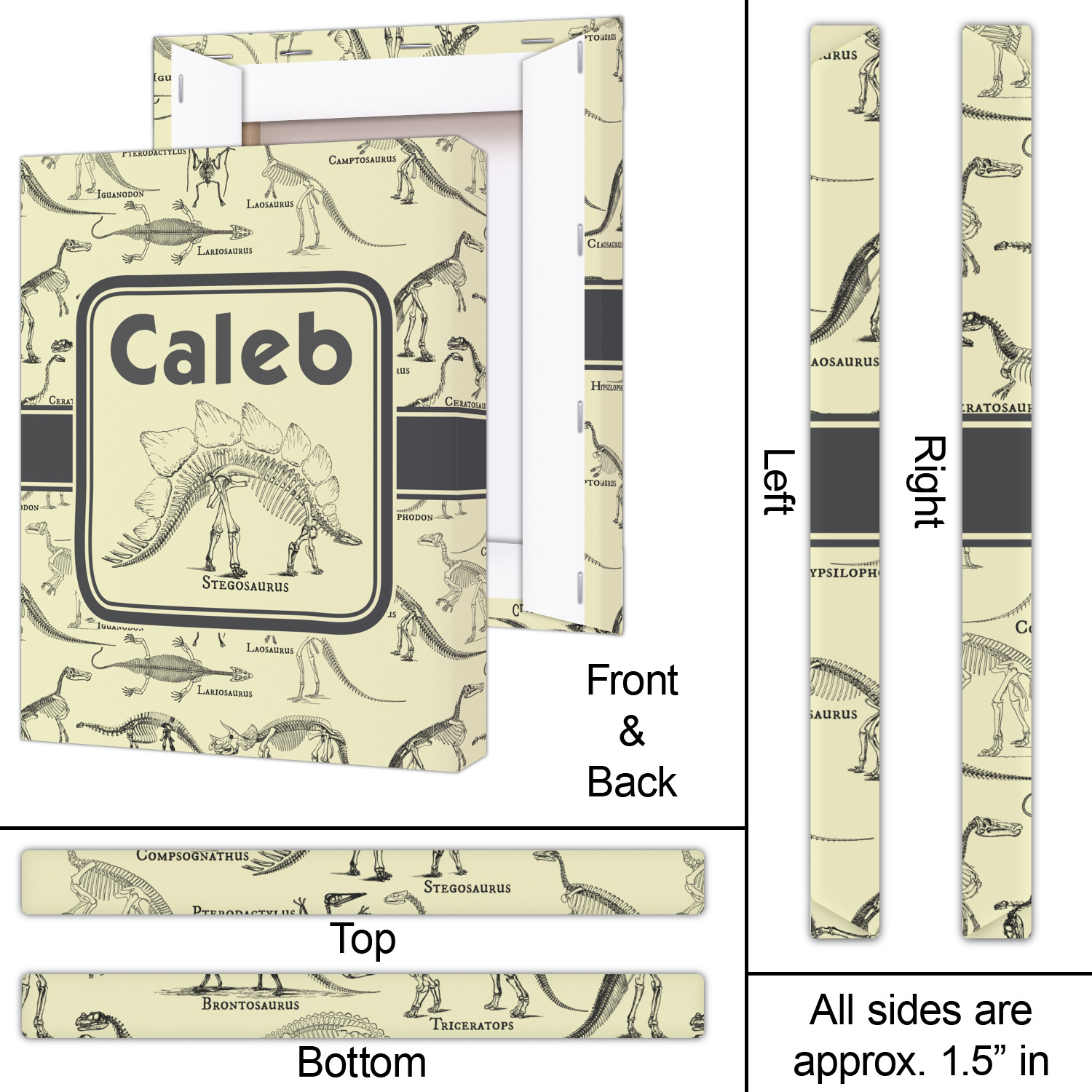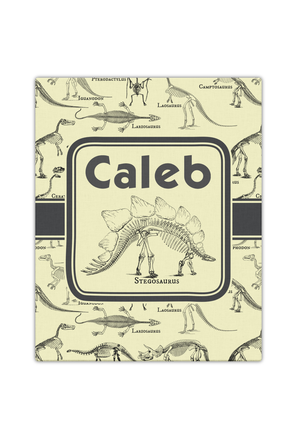 We chose to feature our design with a dark grey classic ribbon, a square label featuring the Stegosaurus Skeleton along with the child's name for personalization. All the Dinosaur Skeletons are available in our system - so you can your child's favorite dino and feature it.