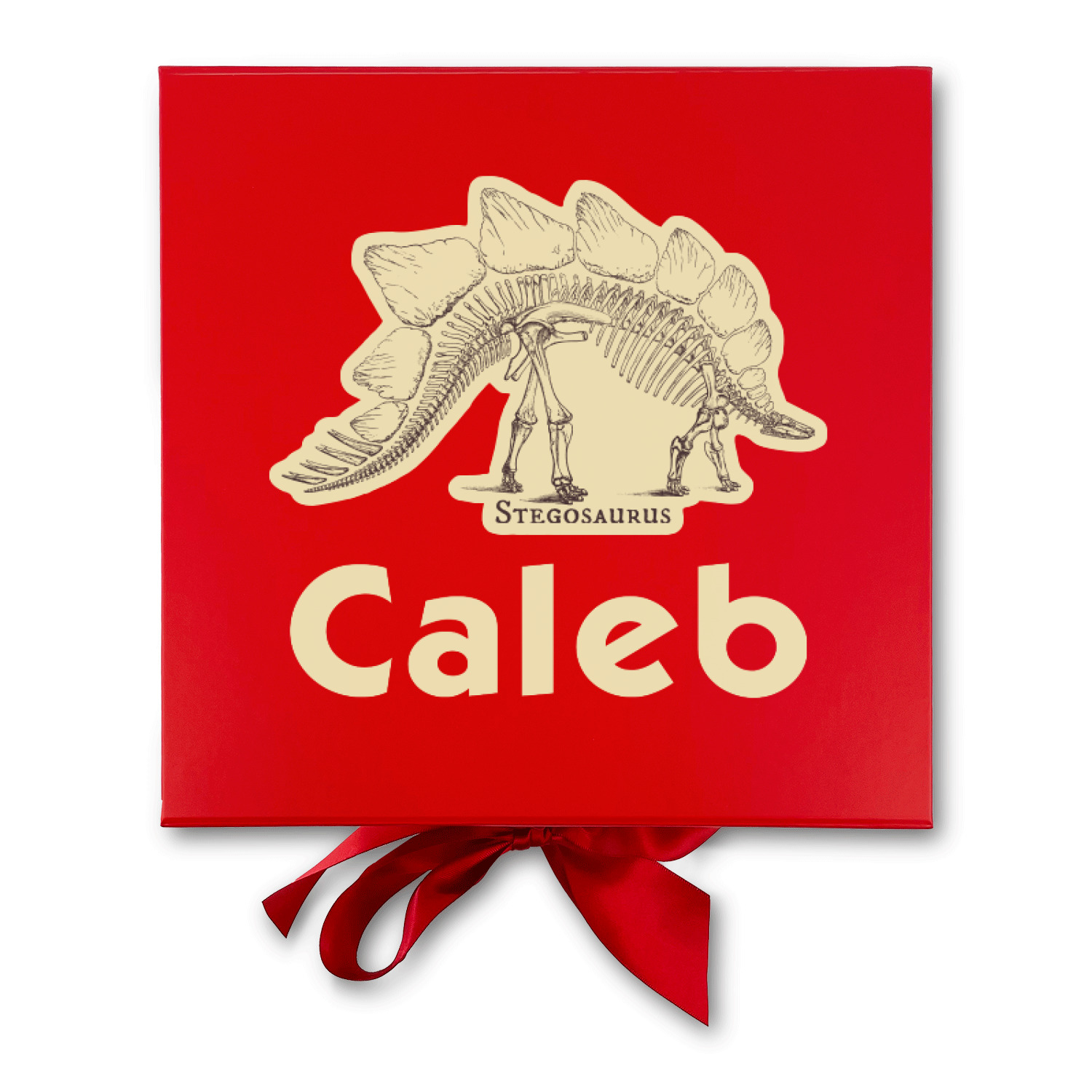 We chose to feature our design with a dark grey classic ribbon, a square label featuring the Stegosaurus Skeleton along with the child's name for personalization. All the Dinosaur Skeletons are available in our system - so you can your child's favorite dino and feature it.