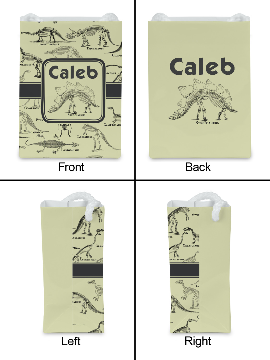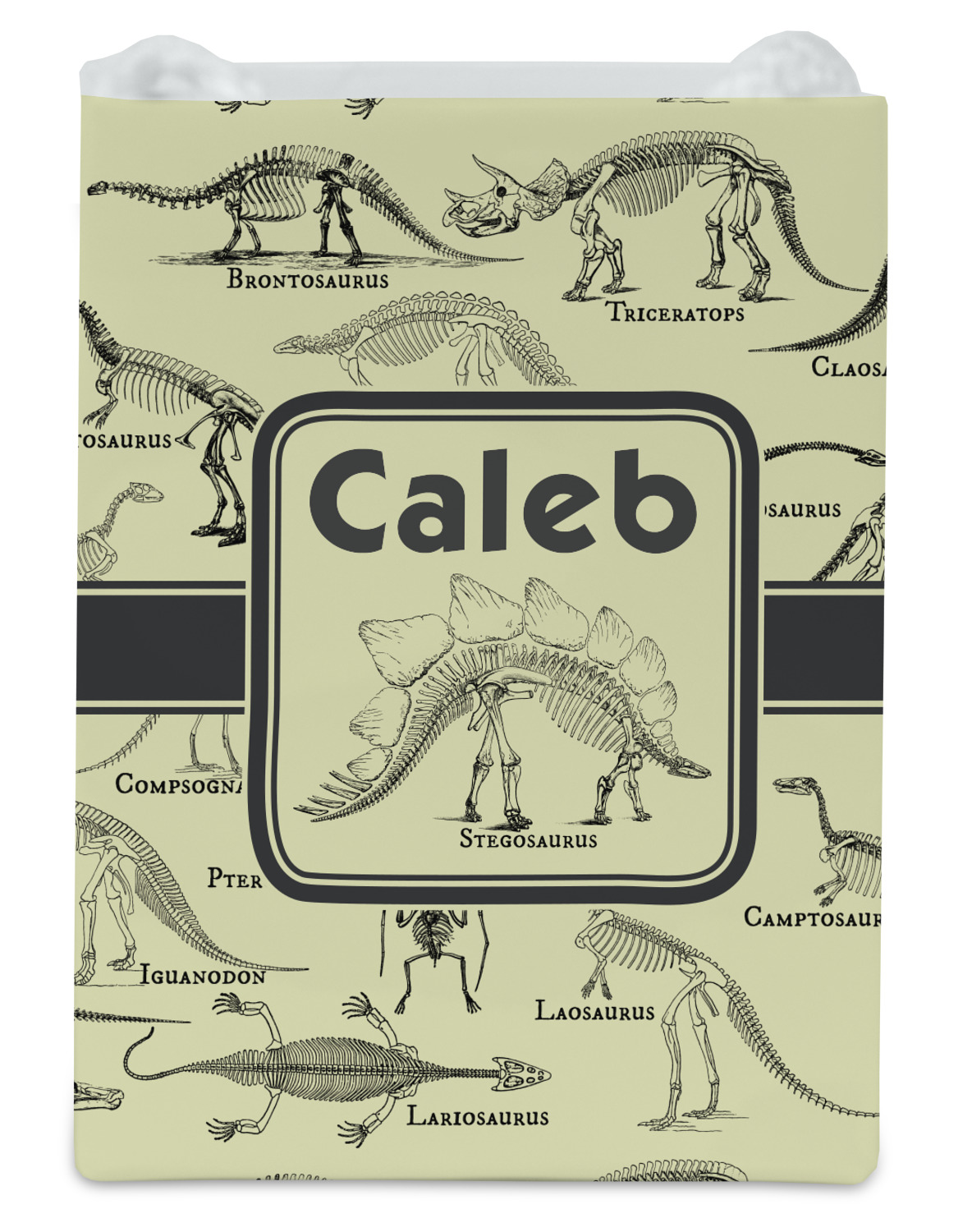 We chose to feature our design with a dark grey classic ribbon, a square label featuring the Stegosaurus Skeleton along with the child's name for personalization. All the Dinosaur Skeletons are available in our system - so you can your child's favorite dino and feature it.