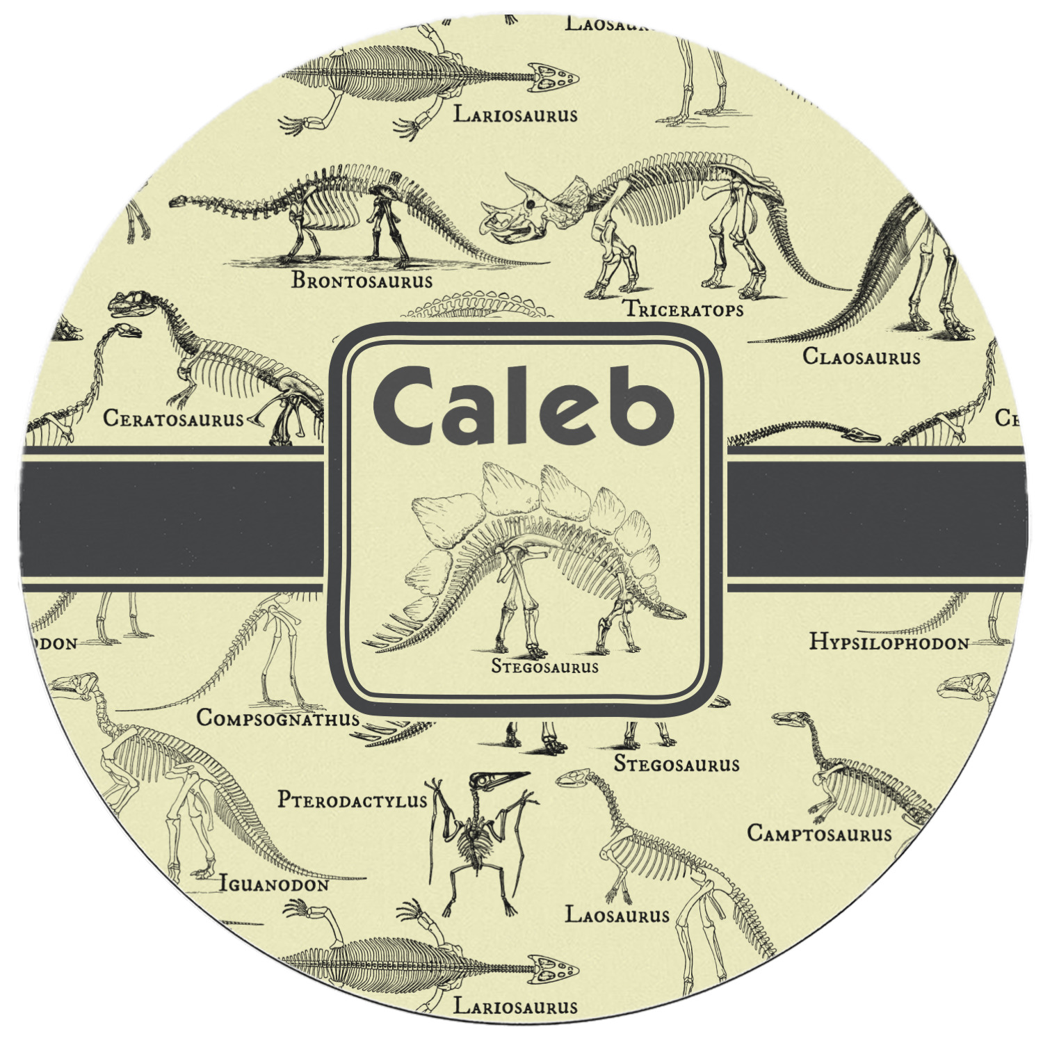 We chose to feature our design with a dark grey classic ribbon, a square label featuring the Stegosaurus Skeleton along with the child's name for personalization. All the Dinosaur Skeletons are available in our system - so you can your child's favorite dino and feature it.