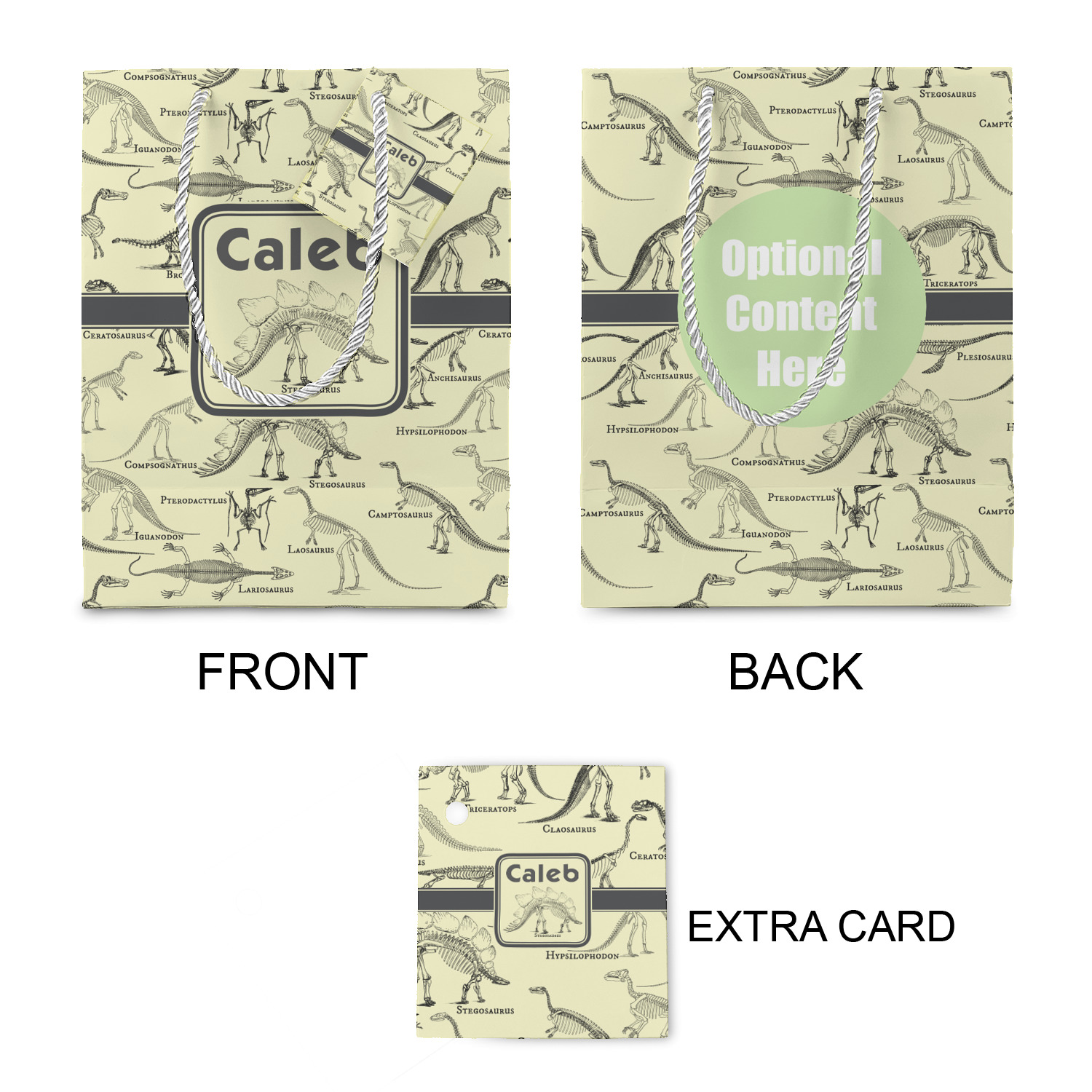We chose to feature our design with a dark grey classic ribbon, a square label featuring the Stegosaurus Skeleton along with the child's name for personalization. All the Dinosaur Skeletons are available in our system - so you can your child's favorite dino and feature it.