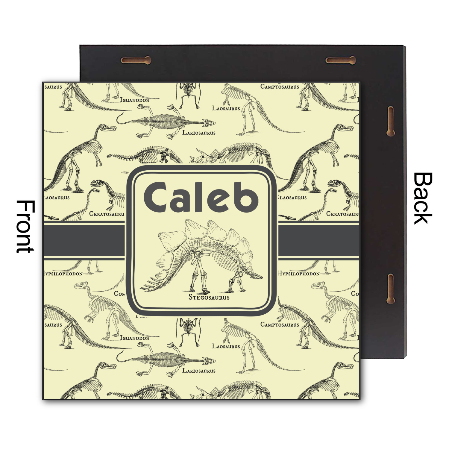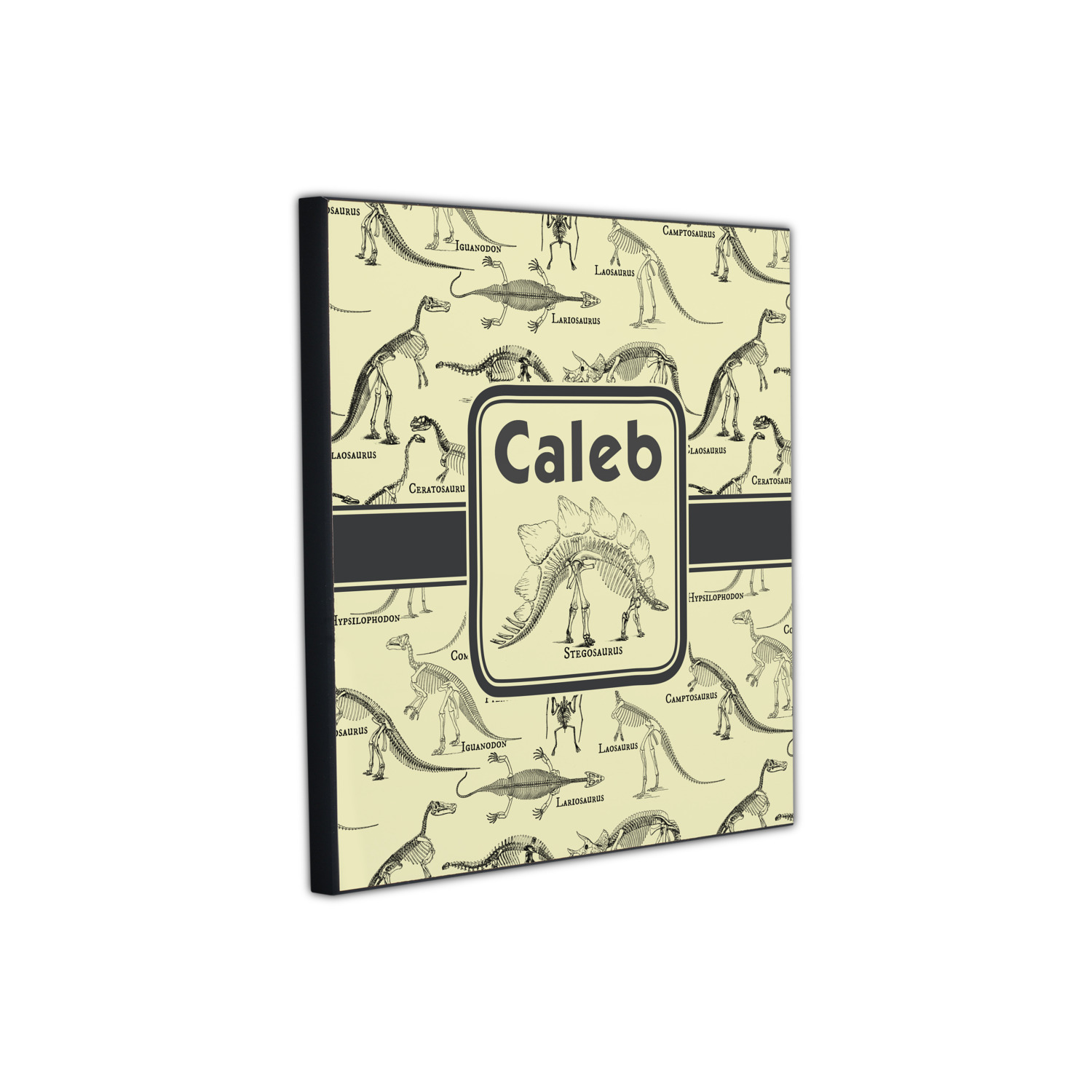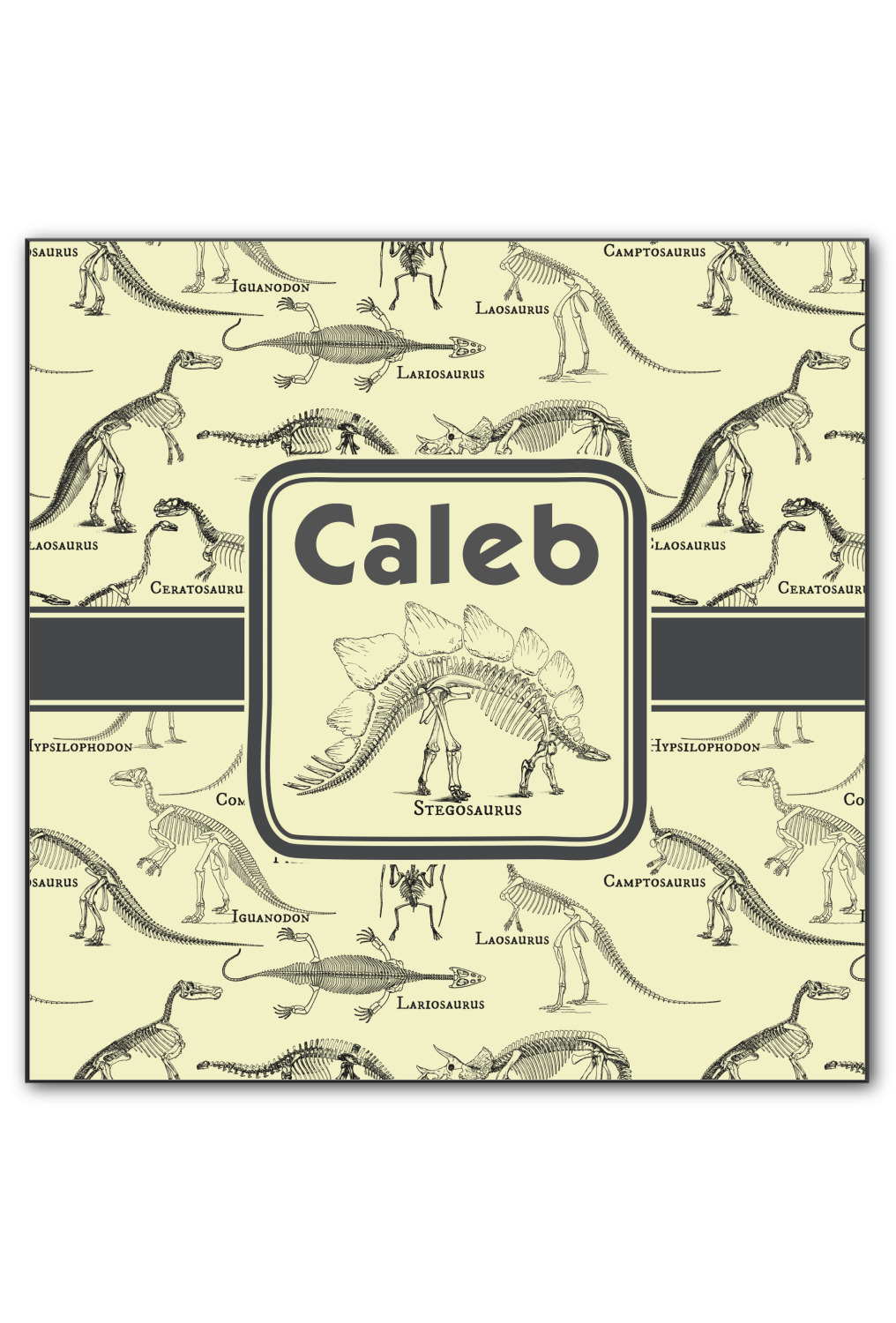 We chose to feature our design with a dark grey classic ribbon, a square label featuring the Stegosaurus Skeleton along with the child's name for personalization. All the Dinosaur Skeletons are available in our system - so you can your child's favorite dino and feature it.
