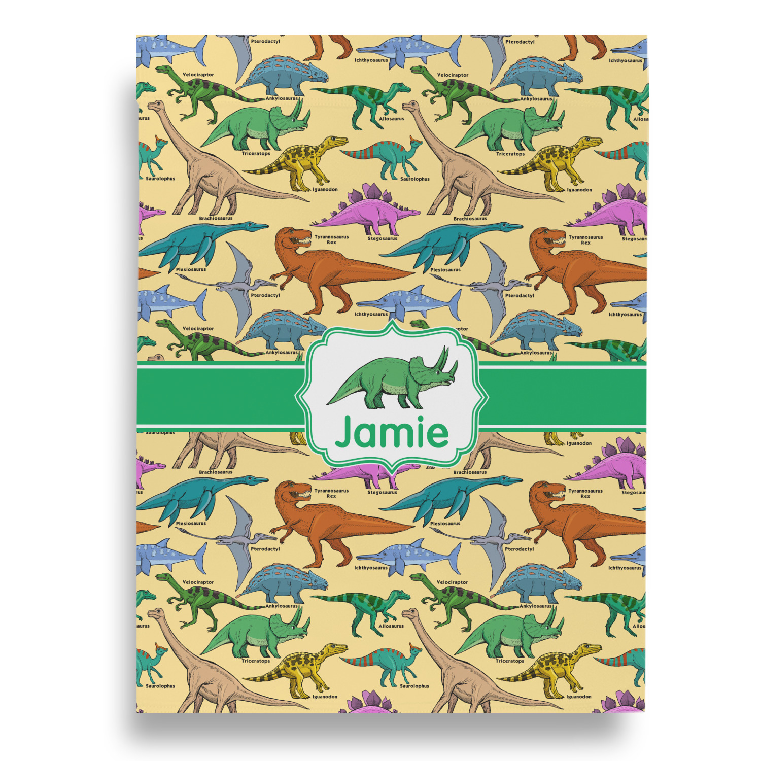 This is made up of 12 different hand drawn dinosaurs (Triceratops, Tyrannosaurus Rex, Velociraptor, Brachiosaurus, Ankylosaurus, Pterodactyl, Stegosaurus, Saurolophus, Plesiosaurus, Allosaurus, Iguanodon and Ichthyosaurus) and each dinosaur has it's type written next to it. We chose a light yellow background with a green ribbon and decorative label; and we chose to use a triceratops and a name inside the label.