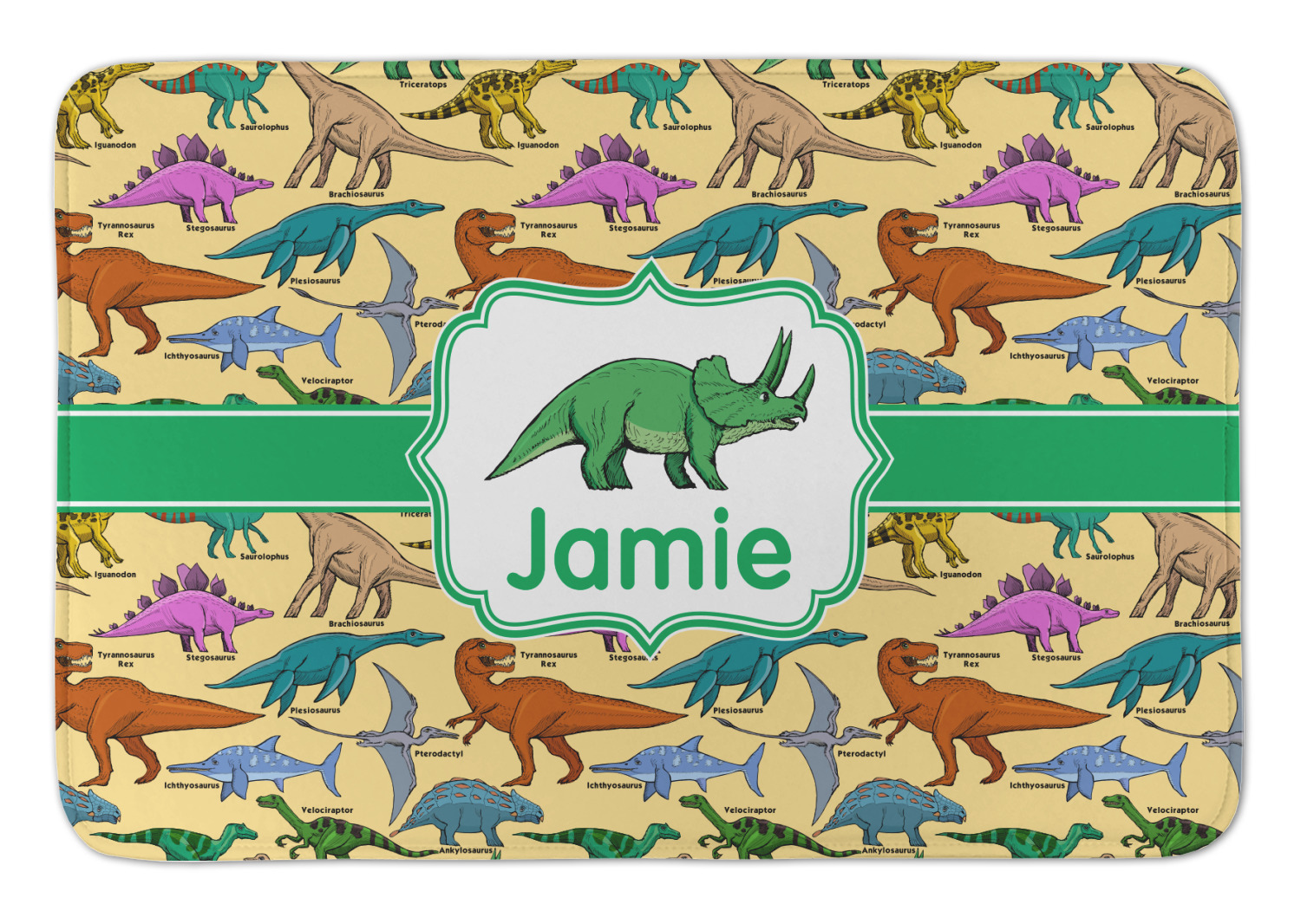 This is made up of 12 different hand drawn dinosaurs (Triceratops, Tyrannosaurus Rex, Velociraptor, Brachiosaurus, Ankylosaurus, Pterodactyl, Stegosaurus, Saurolophus, Plesiosaurus, Allosaurus, Iguanodon and Ichthyosaurus) and each dinosaur has it's type written next to it. We chose a light yellow background with a green ribbon and decorative label; and we chose to use a triceratops and a name inside the label.
