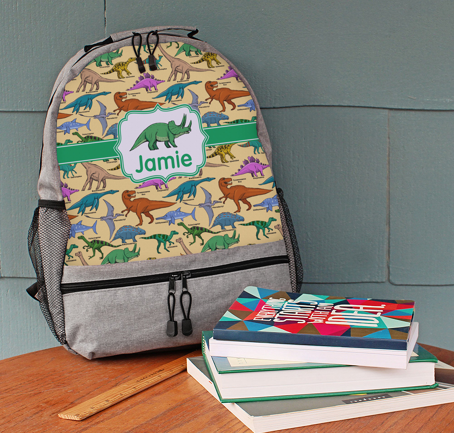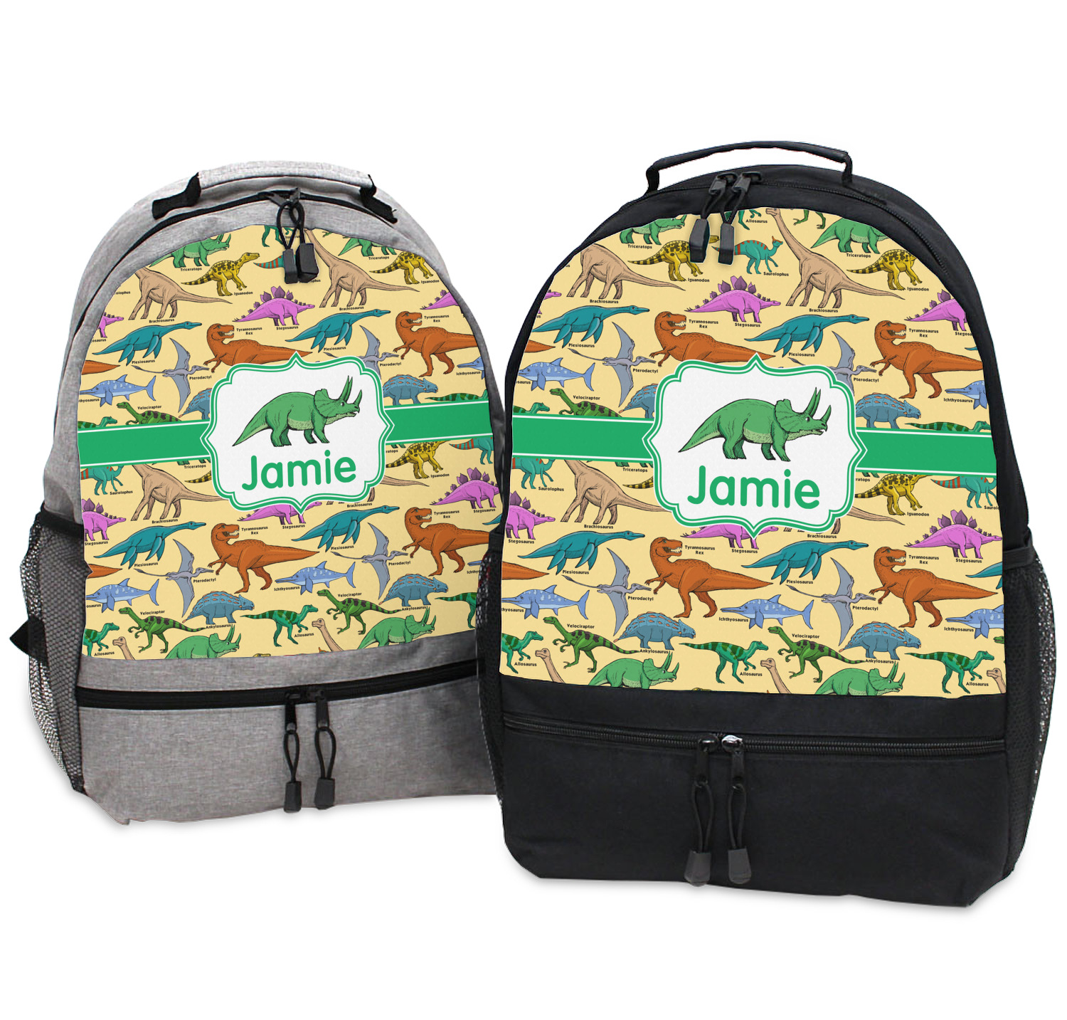 This is made up of 12 different hand drawn dinosaurs (Triceratops, Tyrannosaurus Rex, Velociraptor, Brachiosaurus, Ankylosaurus, Pterodactyl, Stegosaurus, Saurolophus, Plesiosaurus, Allosaurus, Iguanodon and Ichthyosaurus) and each dinosaur has it's type written next to it. We chose a light yellow background with a green ribbon and decorative label; and we chose to use a triceratops and a name inside the label.