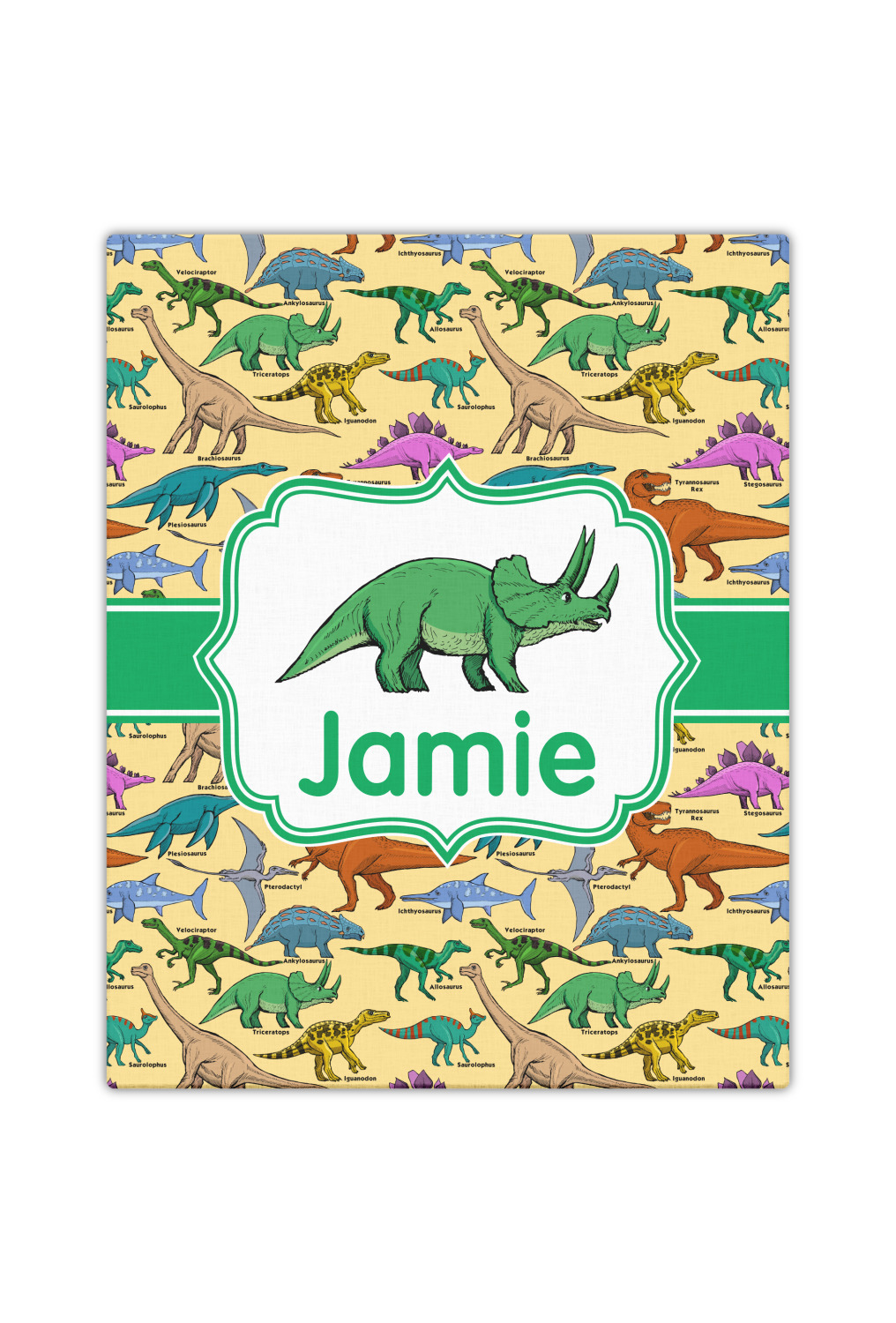 This is made up of 12 different hand drawn dinosaurs (Triceratops, Tyrannosaurus Rex, Velociraptor, Brachiosaurus, Ankylosaurus, Pterodactyl, Stegosaurus, Saurolophus, Plesiosaurus, Allosaurus, Iguanodon and Ichthyosaurus) and each dinosaur has it's type written next to it. We chose a light yellow background with a green ribbon and decorative label; and we chose to use a triceratops and a name inside the label.