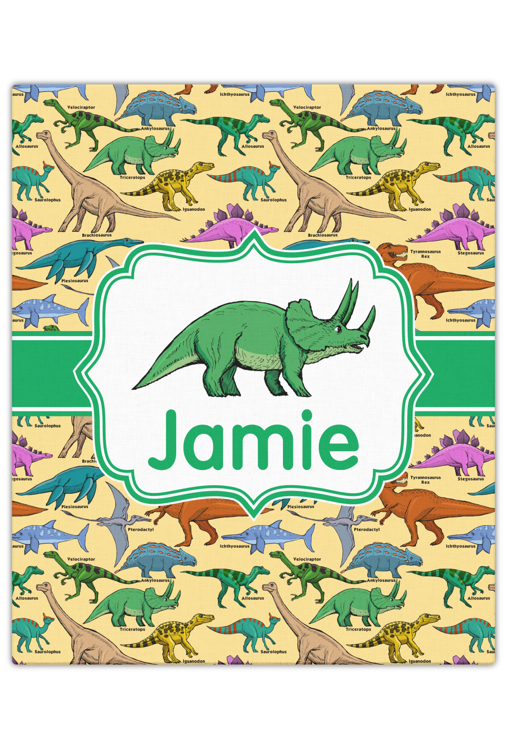 This is made up of 12 different hand drawn dinosaurs (Triceratops, Tyrannosaurus Rex, Velociraptor, Brachiosaurus, Ankylosaurus, Pterodactyl, Stegosaurus, Saurolophus, Plesiosaurus, Allosaurus, Iguanodon and Ichthyosaurus) and each dinosaur has it's type written next to it. We chose a light yellow background with a green ribbon and decorative label; and we chose to use a triceratops and a name inside the label.