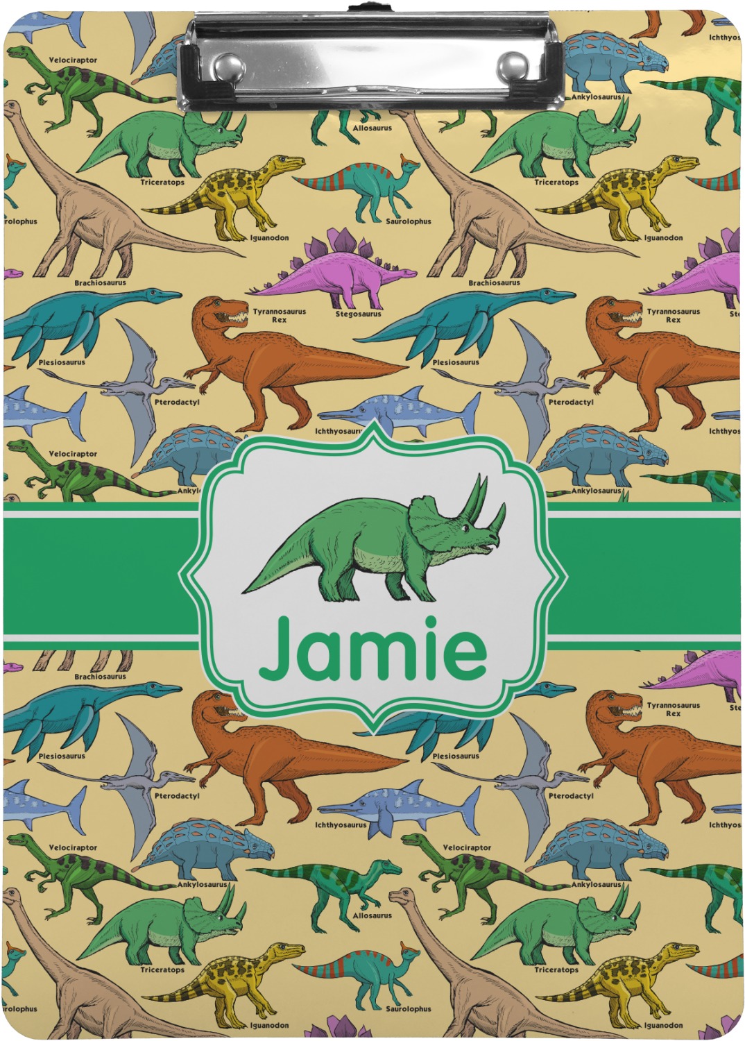 This is made up of 12 different hand drawn dinosaurs (Triceratops, Tyrannosaurus Rex, Velociraptor, Brachiosaurus, Ankylosaurus, Pterodactyl, Stegosaurus, Saurolophus, Plesiosaurus, Allosaurus, Iguanodon and Ichthyosaurus) and each dinosaur has it's type written next to it. We chose a light yellow background with a green ribbon and decorative label; and we chose to use a triceratops and a name inside the label.