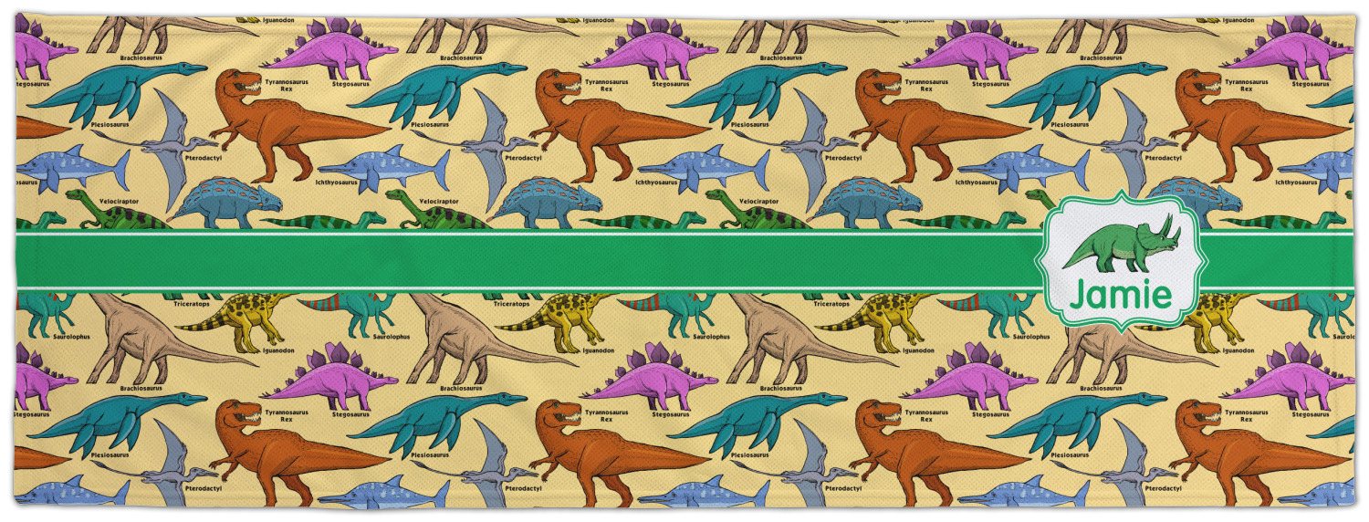 This is made up of 12 different hand drawn dinosaurs (Triceratops, Tyrannosaurus Rex, Velociraptor, Brachiosaurus, Ankylosaurus, Pterodactyl, Stegosaurus, Saurolophus, Plesiosaurus, Allosaurus, Iguanodon and Ichthyosaurus) and each dinosaur has it's type written next to it. We chose a light yellow background with a green ribbon and decorative label; and we chose to use a triceratops and a name inside the label.