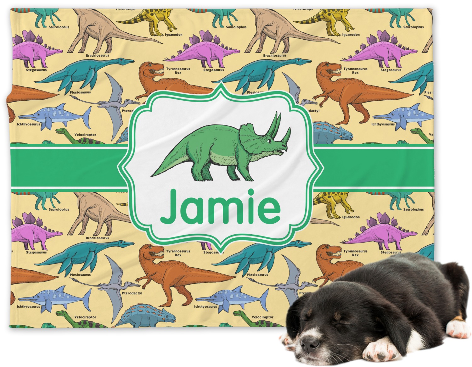 This is made up of 12 different hand drawn dinosaurs (Triceratops, Tyrannosaurus Rex, Velociraptor, Brachiosaurus, Ankylosaurus, Pterodactyl, Stegosaurus, Saurolophus, Plesiosaurus, Allosaurus, Iguanodon and Ichthyosaurus) and each dinosaur has it's type written next to it. We chose a light yellow background with a green ribbon and decorative label; and we chose to use a triceratops and a name inside the label.