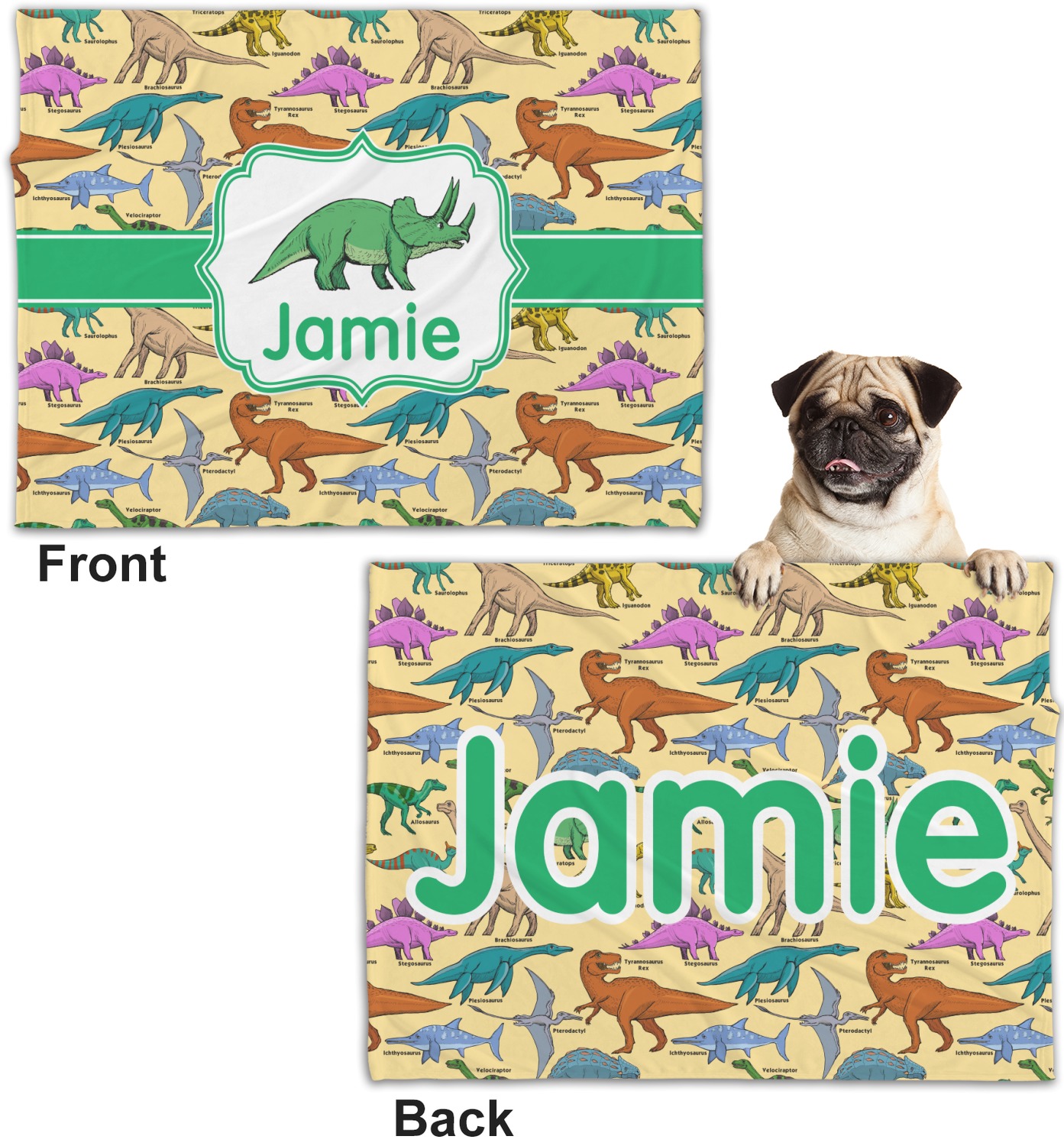 These dog blankets are crafted from a gentle, soft-to-the-touch, minky material. We print your customizations, either matching or differing, on both the top and underside of the blanket. These personalized dog blankets are available in two sizes: regular and large. Our regular size, at 40" x 30", accommodates small and some medium size dogs. At 60" x 50", our large dog blanket is a better fit for bigger breeds. Though specialized for dogs, these blankets still make a thoughtful gift for your favorite feline, or any other pet in mind!