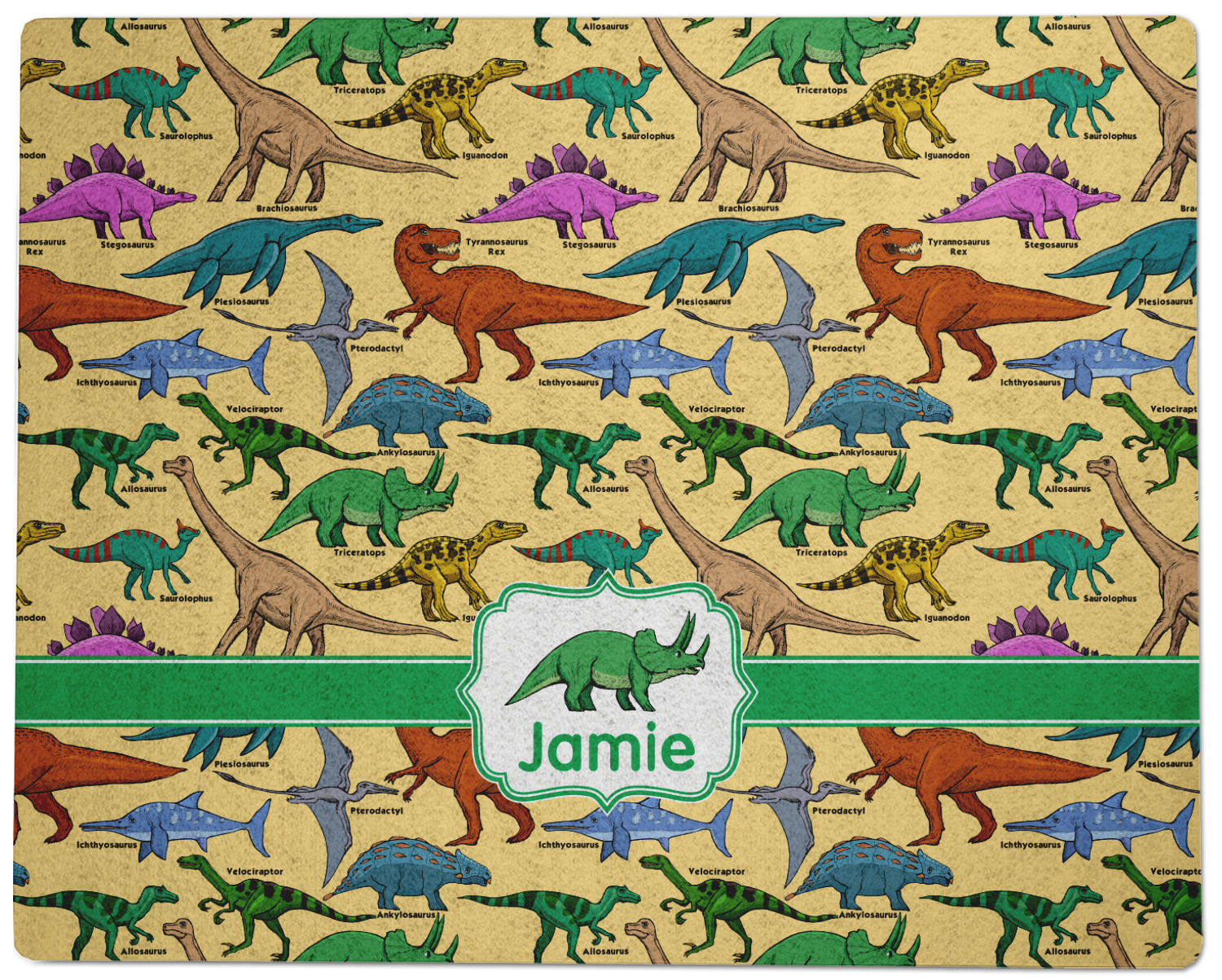 This is made up of 12 different hand drawn dinosaurs (Triceratops, Tyrannosaurus Rex, Velociraptor, Brachiosaurus, Ankylosaurus, Pterodactyl, Stegosaurus, Saurolophus, Plesiosaurus, Allosaurus, Iguanodon and Ichthyosaurus) and each dinosaur has it's type written next to it. We chose a light yellow background with a green ribbon and decorative label; and we chose to use a triceratops and a name inside the label.