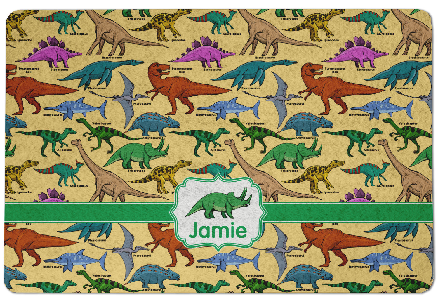 This is made up of 12 different hand drawn dinosaurs (Triceratops, Tyrannosaurus Rex, Velociraptor, Brachiosaurus, Ankylosaurus, Pterodactyl, Stegosaurus, Saurolophus, Plesiosaurus, Allosaurus, Iguanodon and Ichthyosaurus) and each dinosaur has it's type written next to it. We chose a light yellow background with a green ribbon and decorative label; and we chose to use a triceratops and a name inside the label.